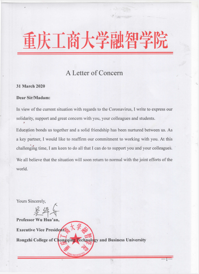值此特殊时期,我校将与姊妹院校携手并进,共克时艰,不断深化和升华珍贵的合作友谊,为双方的国际交流与合作增加信心。