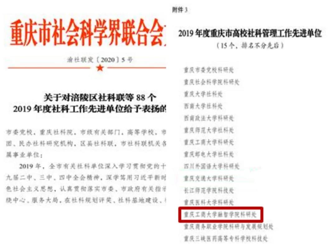 重庆市社科联对全市社科工作先进单位给予通报表扬。我校在科研管理工作上取得了突出成绩,被社科联评为2019 年度重庆市高校社科管理工作先进单位。