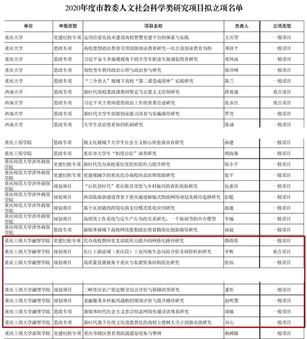 重庆市就教育委员会人文社科项目公布,我校李辉老师立项规划类重点项目,董昕、张灿、赵明慧老师立项规划类一般项目,颜萌萌老师立项党建纪检专项项目,刘心、周敏老师立项思政专项项目。
