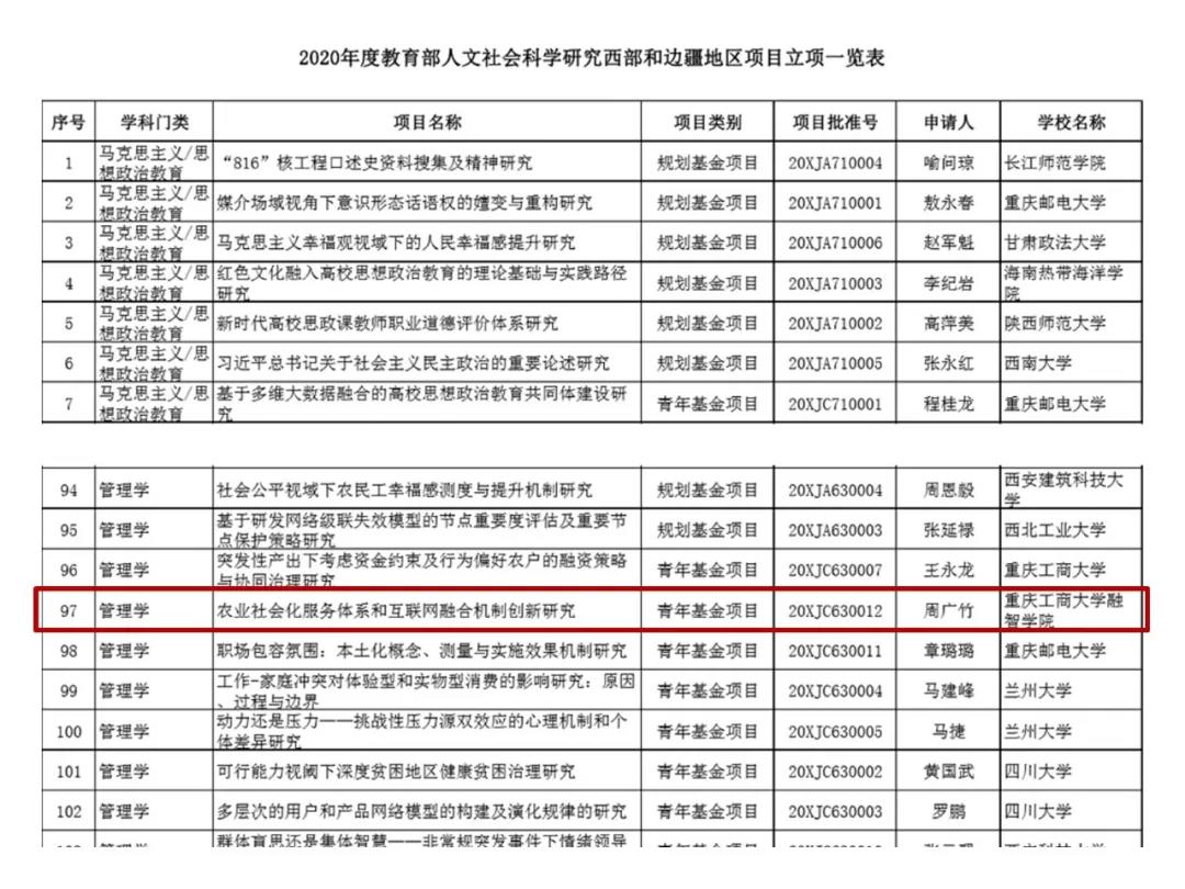2020年教育部人文社会科学研究项目立项结果予以公布。我校周广竹副教授申报的“农业社会化服务体系和互联网融合机制创新研究”获批青年基金项目立项,该项目是我校承担的第四个教育部人文社会科学研究项目,该项目是教育部面向全国普通高等学校设立的项目,其覆盖面广、影响大,具有重要的示范和引导作用。此类项目的逐年增加,对于提升我校人文社科研究水平,促进人文社会科学的繁荣和发展具有重要意义。
