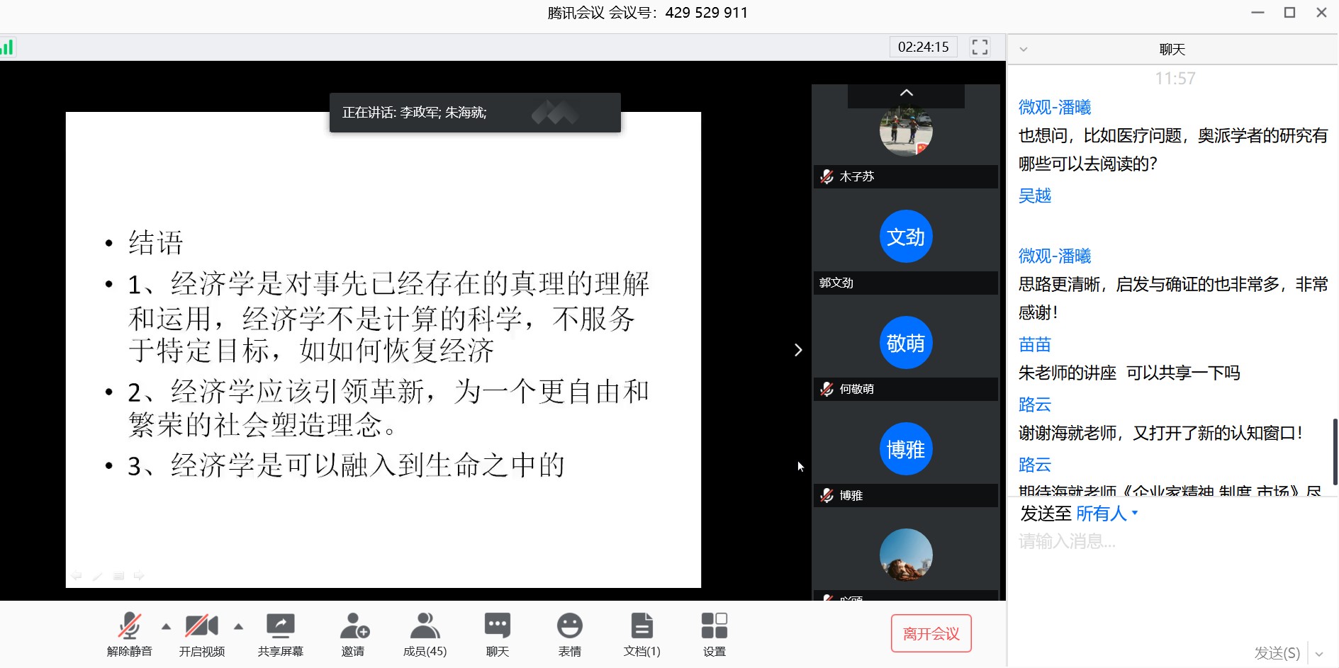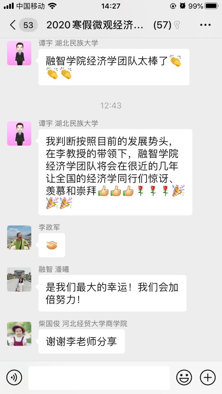 2020年4月29日上午9:30,我校经济学教学团队“融智育人”系列讲座第七期在腾讯会议(ID:429 529 911)如期举行。受我校经济学教学团队首席教授李政军的邀请,浙江工商大学经济学院教授朱海就博士,做题为“人的行为概述”的学术探讨报告。我校经济学院副院长李红平、团队19位老师以及部分校内老师和同学参加了此次报告会。