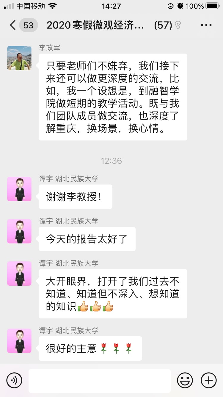 与以往不同的是,本次活动的参与者还有来自重庆市内、市外多所兄弟院校经济学教学团队的教师和学生共40余人,包括湖北民族大学谭宇教授、北方民族大学关春玉副教授、聊城大学初丽霞副教授、广州大学聂鹏博士,延边大学的李松林博士、河北经贸大学商学院的柴国俊老师以及四川外国语大学的许静教师团队等等。之所以有这样多的校外教师和同学参与,是基于我校经济学团队在2020年寒假研修班所形成的开放性的,从教学、科研、读书等多维度搭建起来的,打破地域界限、跨校际的学习共同体,此次活动正是基于经济学团队坚持探索、持续推进的跨校际学习共同体的一种成果显现。
