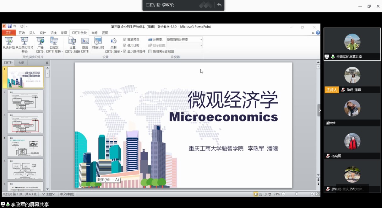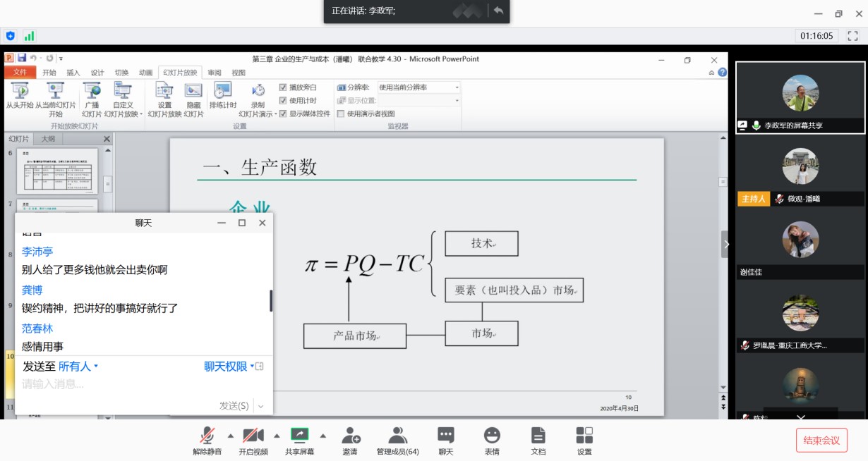2020430日,我校经济学教学团队面向全校教师开放《微观经济学》联合教学的在线课堂。教学活动共两场,分别是上午李政军教授与潘曦老师以“翻转课堂”形式展开的联合教学,及下午李政军教授与刘春兰老师以传统教学方式展开的联合教学。参与的老师有团队14位成员、部分校内老师及学校督导专家。