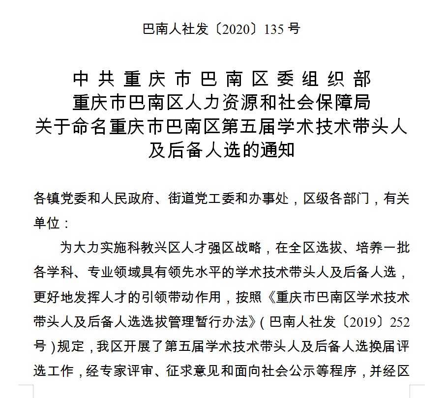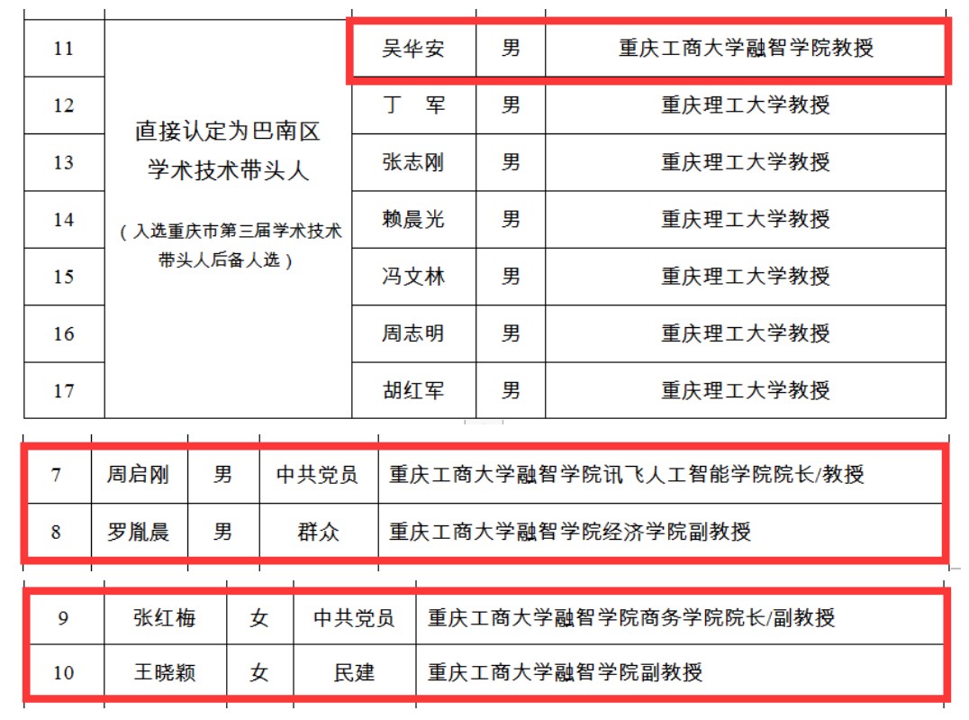 2020年5月21日,中共重庆市巴南区委组织部、重庆市巴南区人力资源和社会保障局印发了《关于命名重庆市巴南区第五届学术技术带头人及后备人选的通知》(巴南人社发〔2020〕135号)。经过专家评审、征求意见和面向社会公示等程序,并经重庆市巴南区委人才工作领导小组同意,确定重庆市巴南区学术技术带头人82人,重庆市巴南区学术技术带头人后备人选40人。我校常务副校长吴华安教授直接被认定为重庆市巴南区学术技术带头人,讯飞人工智能学院院长周启刚教授、经济学院罗胤晨副教授被命名为重庆市巴南区学术技术带头人,商务学院院长张红梅副教授、商务学院王晓颖副教授被命名为重庆市巴南区学术技术带头人后备人选。这是我校打造“三爱五高”人才队伍以来,在人才队伍建设和能力提升方面取得的一项可喜成绩。