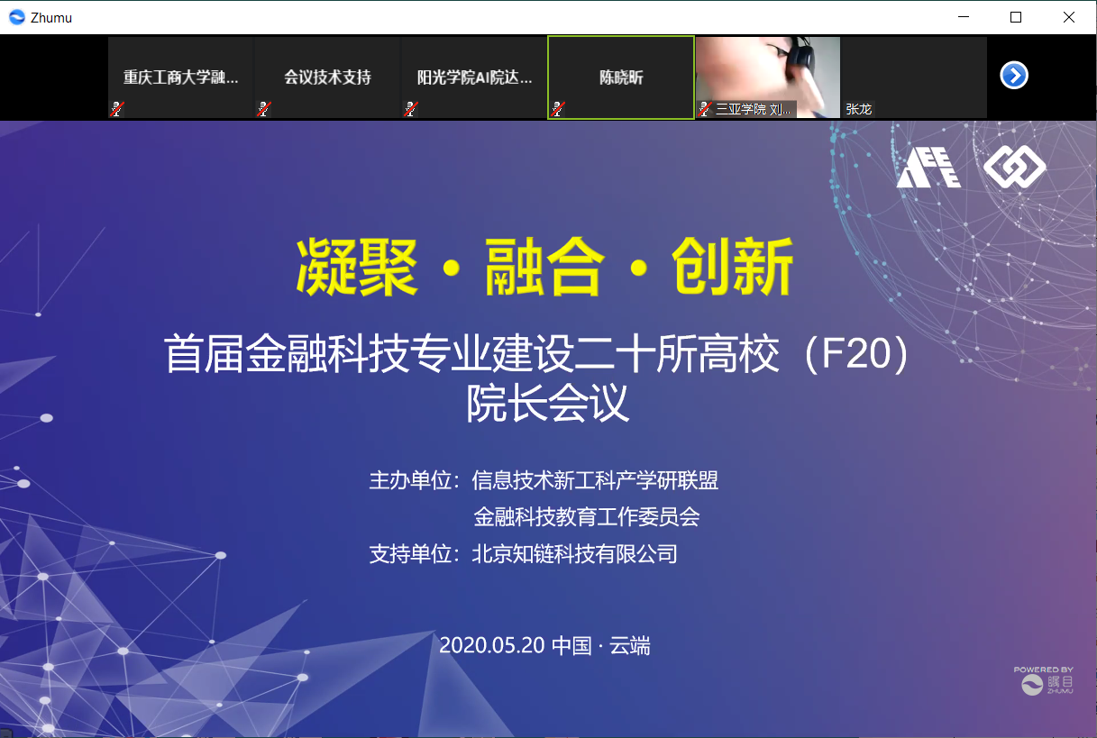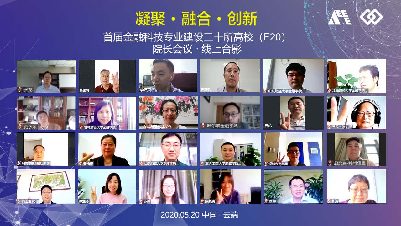 2020年5月20日,在教育部和工信部指导下,由信息技术新工科产学研联盟金融科技教育工作委员会主办的“首届金融科技专业建设二十所高校(F20)院长会议”通过在线方式顺利举行。本次会议以“凝聚·融合·创新”为主题,全国20所开设金融科技专业的高校相关学院院长和北京知链科技有限公司刘全宝总裁、神州数码信息服务股份有限公司赵文甫副总裁等金融科技业界代表齐聚云端,共商金融与科技交叉融合教育繁荣大计。会议由信息技术新工科产学研联盟金融科技教育工作委员会主任朱建明主持,信息技术新工科产学研联盟张龙执行秘书长和中央财经大学金融学院李建军院长分别代表主办方和参会院长致辞。