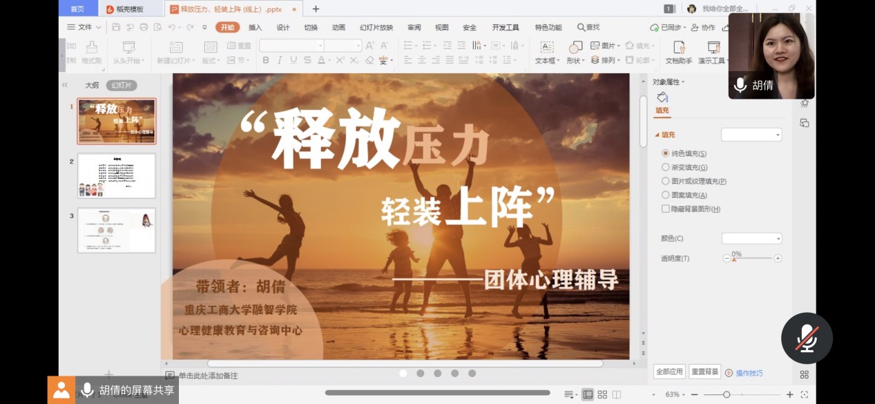 2020年5月28日下午13:00-14:00,我校5.25心理健康活动月系列活动之“释放压力,轻装上阵”团体心理辅导活动顺利开展。活动在线上平台——腾讯会议上举行,由心理健康教育与咨询中心胡倩老师主持。参加此次线上活动的成员是10位来自我校2016级的同学们,通过自愿报名的形式参加。