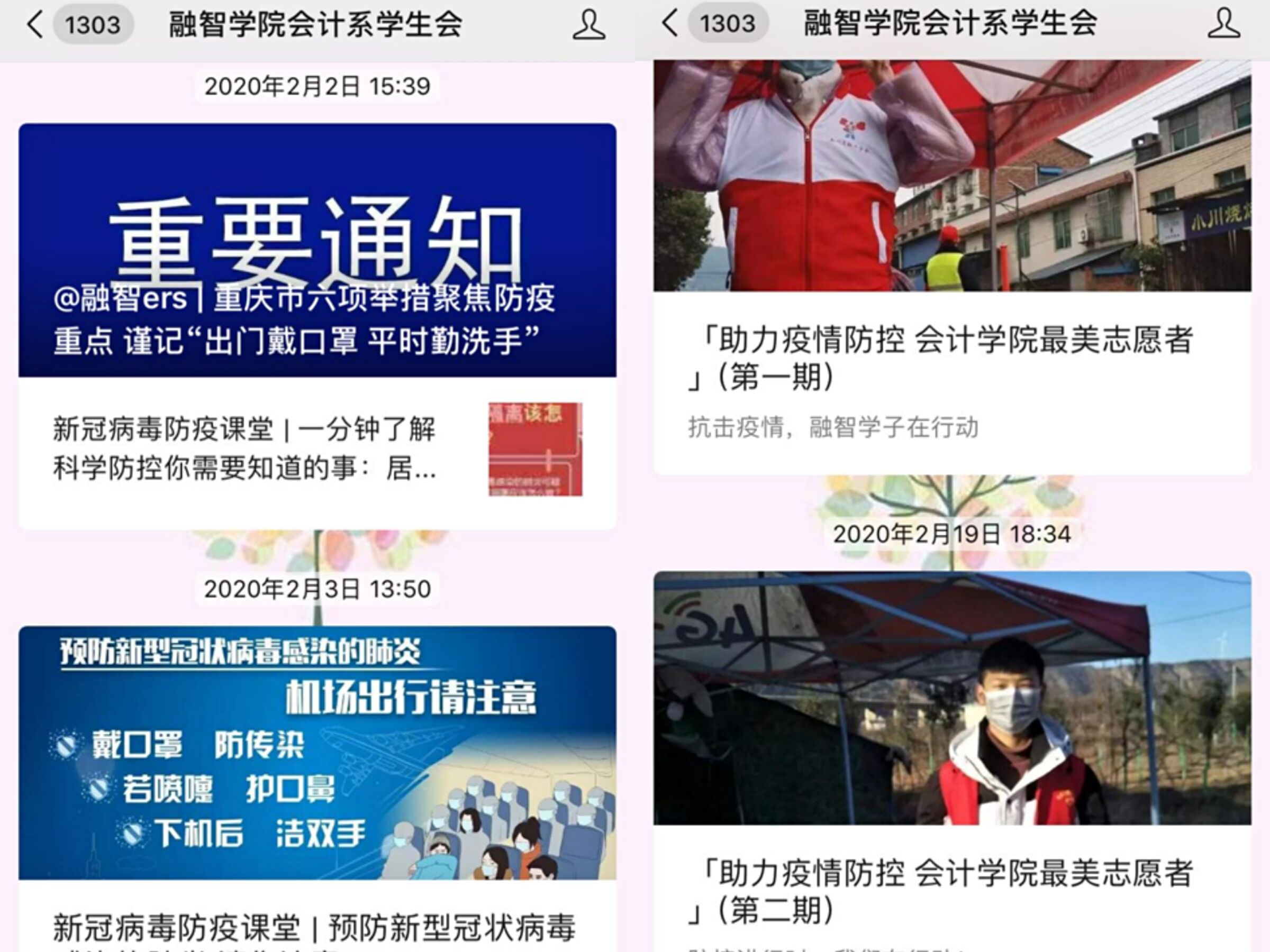 “强宣传”会计学院团总支在党总支的带领下,充分发挥团学组织新媒体平台建设优势,将防疫知识学习、学校疫情防控工作精神、学院抗“疫”青年典型等作为重点宣传任务,以此将团员青年的思想引领做进青年学生心里,凝聚共识,坚定信心。“聚氛围”开展抗疫主题系列活动营造青春战“疫”浓厚氛围。开展“弘扬雷锋精神,共筑‘战役’长城”创意作品大赛;承办“爱国之心 报国之行”网络艺术节——“牵梦诗华”校园诗词大赛;各团支部开展爱国主义教育,以爱国主义精神为契机开展“这个春天,爱你的故事”微视频创作比赛,用镜头记录下了身边爱国、爱家、爱生活、爱学习的故事,以此彰显了爱国主义情感。