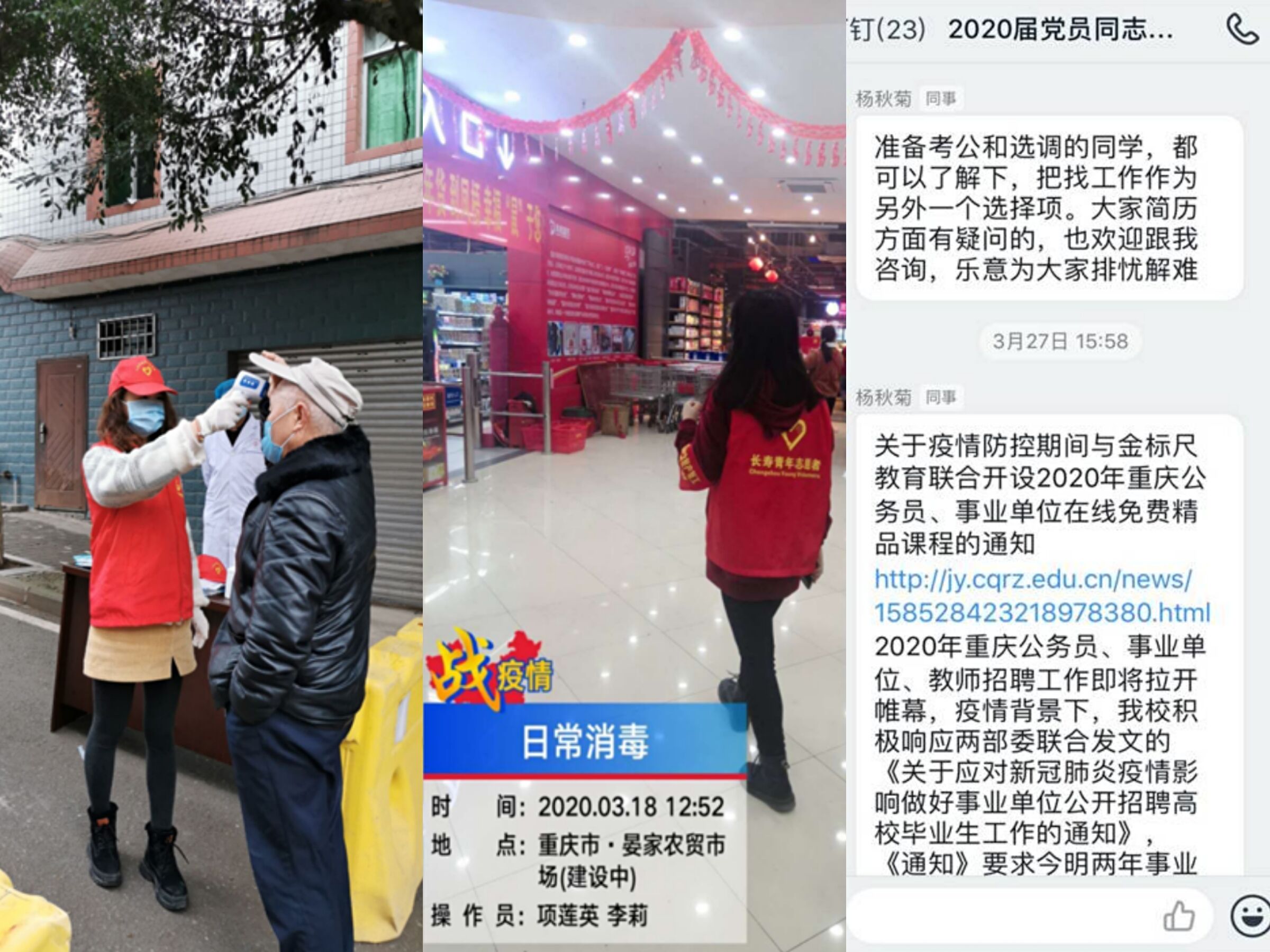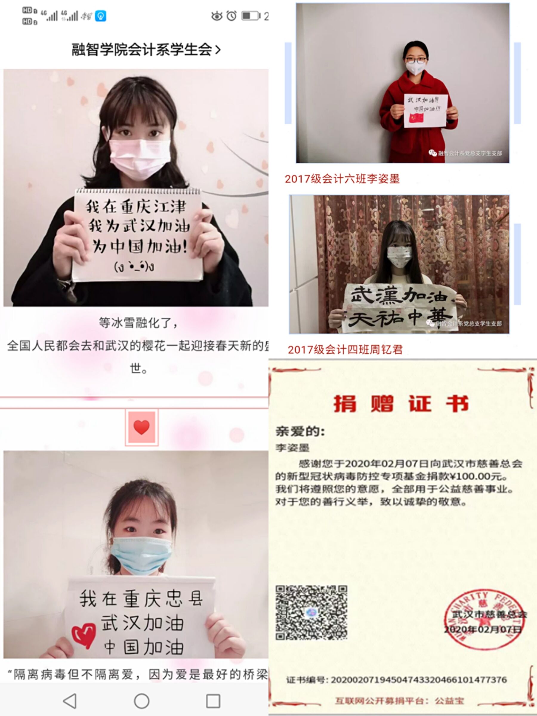 “祝福”:会计学院学生党支部、团总支学生会发起祝福武汉、祝福祖国的活动,通过网络送上平安祝福。“捐赠”:会计学院师生党员自愿捐款近4000元。“服务”:以李姿墨、李莉、冯小书为代表的学生党员参与到家庭所在地社区、村居的防疫工作中,用实际行动践行共产党员的初心与使命。“帮扶”:针对2020届毕业生党员求职情况进行了摸底,并展开简历指导。