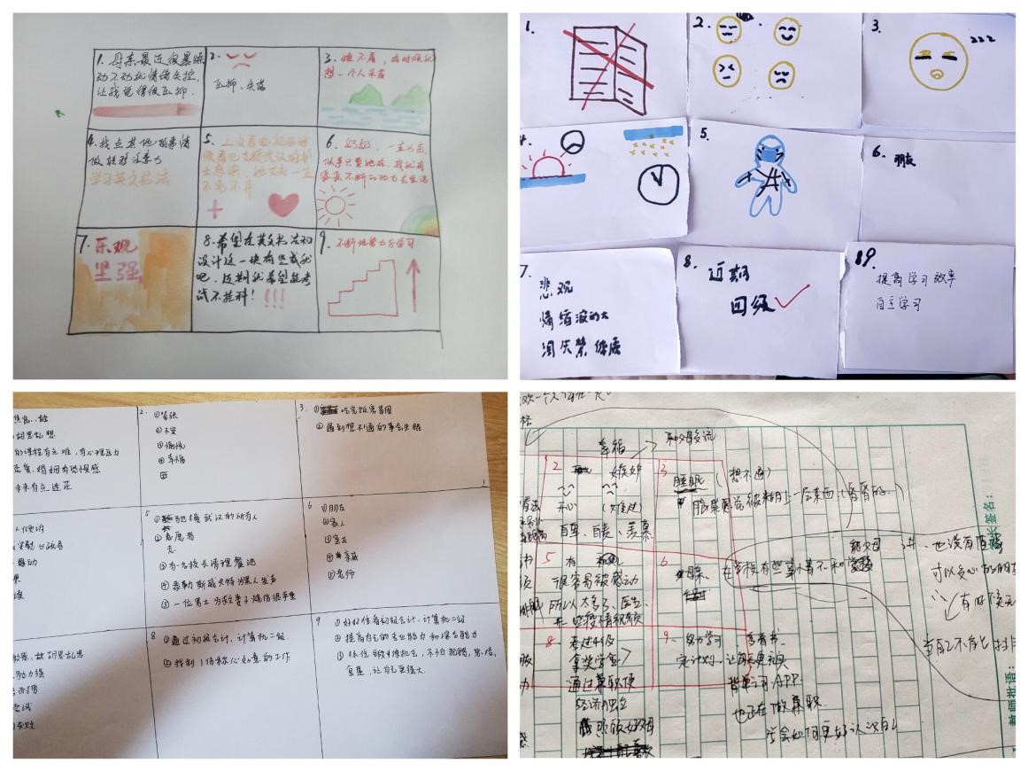 活动伊始,胡倩老师与同学们一起阅读了“宣誓词”,即团体规范,并邀请同学们以“家乡、爱好、性格特质和姓名”的方式进行了自我介绍。在接下来的活动过程中,老师通过“昨日重现九宫格”活动,邀请同学们从“疫情期间你遇到的问题、身心状态发生了哪些变化、有效的应对方式、对未来的期待......”等九个方面,以绘画、分享、相互点评的形式,带领大家梳理了自身的心理状态,同学们的困惑主要表现在家庭关系、人际交往、学习压力等方面。同学们通过依次分享自己的“九宫格”,情绪得到了宣泄,从而探索出了更有效的心理调适方式。随后,老师通过“防疫知识小课堂”向大家普及了防护常识,展示了“蝴蝶拍”放松法的操作步骤。最后,同学们表达了参加此次活动的感受,大家表示此次活动是一次特殊的体验,有效地释放了大家在疫情期间的负面情绪,学习到了更有效的心理调适技巧。