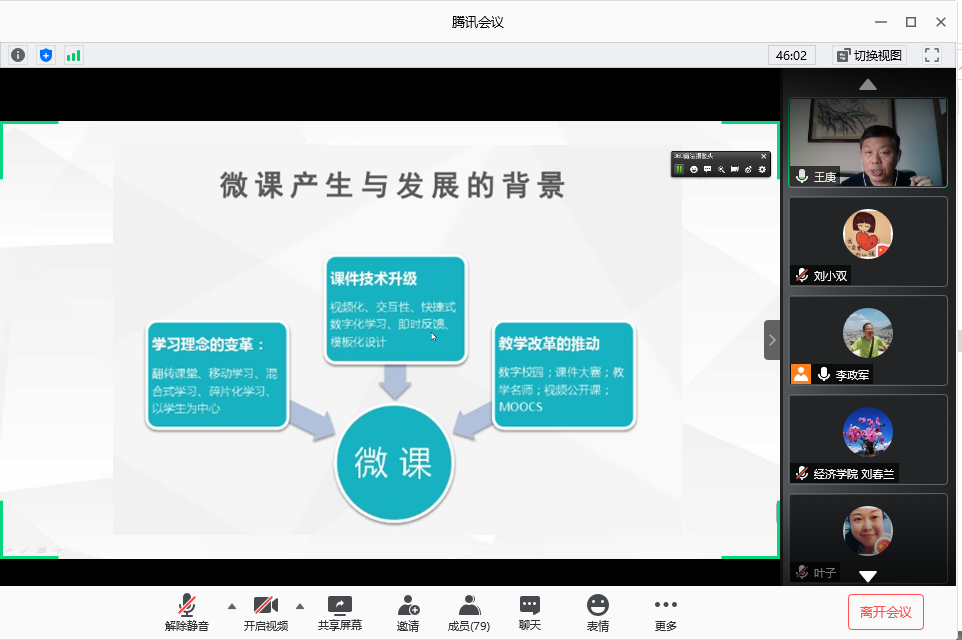 7月13日,我校经济学教学团队和教师发展中心联合在腾讯会议(ID:549162107)举办了第九期“融智育人”系列讲座,19位团队成员和来自校内外78位高校教师参加了本次活动,活动由校经济学教学团队首席教授李政军主持。  本期报告会的主讲嘉宾是南京财经大学首届教学名师、江苏省政协委员、全国教育系统劳模、全国模范教师、全国师德先进个人、全国数学建模优秀教师、江苏省高校教学名师、省师德标兵、省五一劳动奖章获得者王庚教授,讲座题目是“优质微课的设计与制作”。