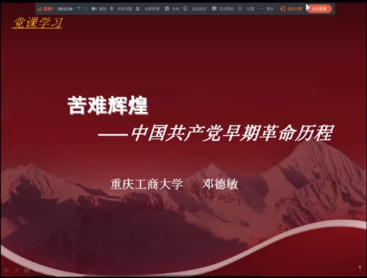 邓德敏教授以“苦难辉煌—中国共产党早期革命历程”为题,以“夹缝中求生存”,“南昌,南昌”,“浴血长征”为主题展开此次党课学习。他首先带大家回顾中国共产党成立99年以来创造的政党革命奇迹和国家执政辉煌。如今的中国共产党是世界第一大党,经过长期努力,中国特色社会主义进入了新时代,但无论我们走得多远,都要不忘初心、牢记使命。