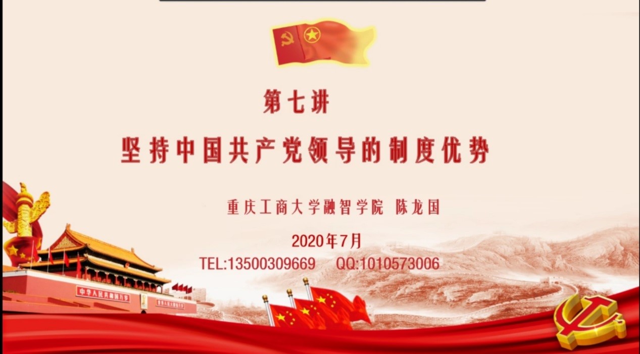 2020年7月23日下午15:30,重庆工商大学融智学院第27期党的知识培训班最后一讲顺利举行。本次培训由重庆工商大学融智学院党委副书记陈龙国担任主讲人。