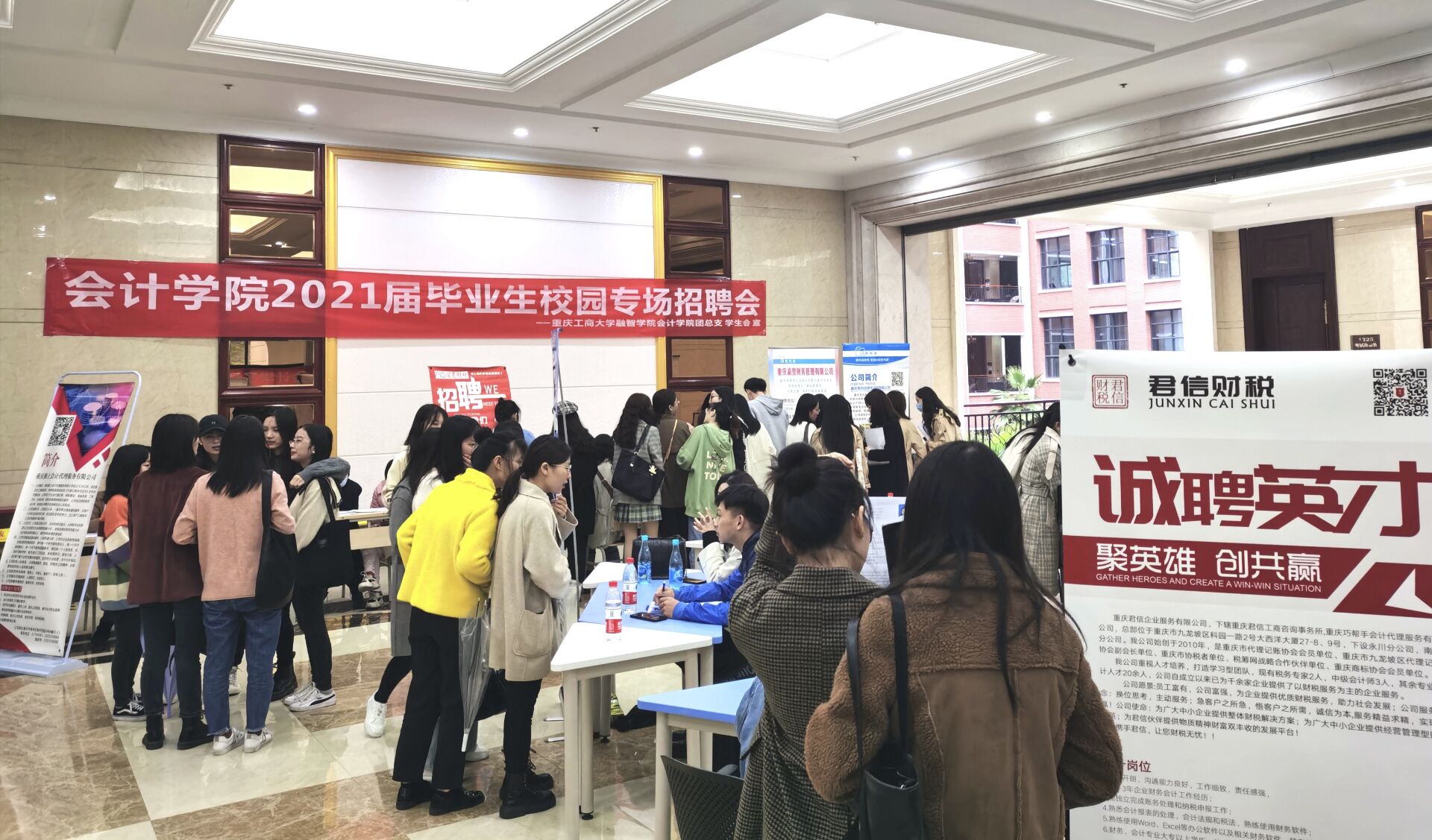 为了更好拓宽我院毕业生就业渠道,为毕业生提供更多就业机会,会计学院于2020年10月28日下午在教学楼二楼大厅举办了2021届毕业生校园就业专场招聘会。此次招聘会吸引了重庆市20余家会计协会相关单位参加,提供了审计助理、会计助理、商务专员等150余个岗位。