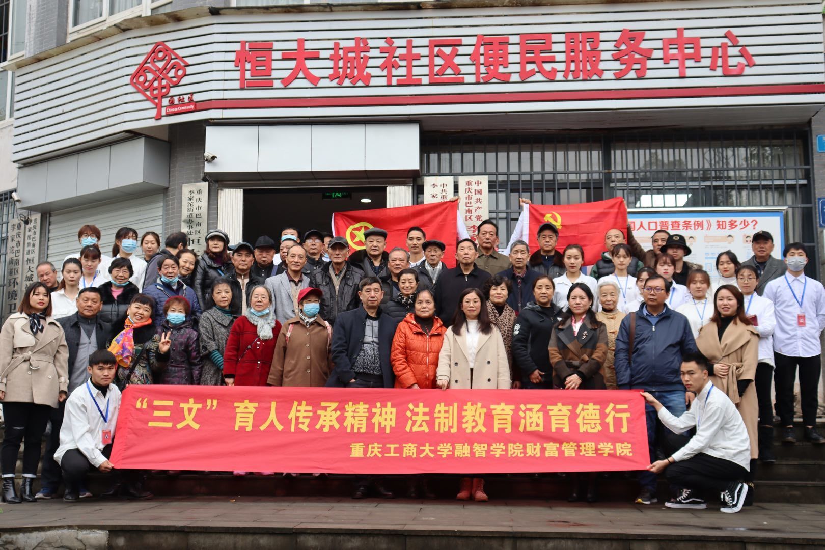 为深入宣传贯彻党的十九届五中全会新思想、新观点、新要求、新目标、新任务指导思想,学习党员前辈先进性,积极落实“党建带团建”的工作,我校财富管理学院于11月27日上午在巴南区李家沱恒大城社区居民委员会教学基地开展了主题为“党建带团建,共筑新时代”的特色活动。出席本次活动的嘉宾有:恒大城社区党委副书记刘余,我校马克思主义学院院长常晓薇副教授,财富管理学院党总支副书记宋钰静,马克思主义学院陈开江副教授,财富管理学院学团办副主任徐丽锦老师、学生党支部书记张欢,部分社区党员同志及我校学生代表。