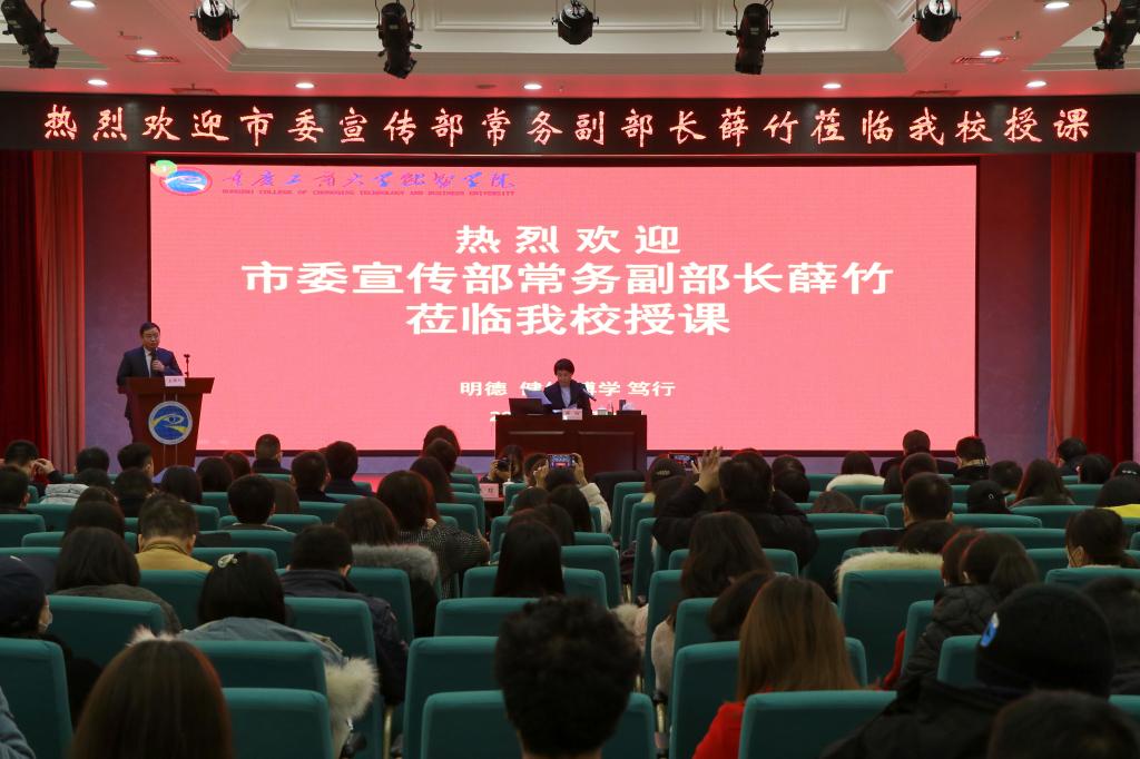 为深入学习宣传贯彻党的十九届五中全会和市委九届五次全会精神,进一步深化干部师生对全会精神的理解和把握,按照《中共重庆市委教育工作领导小组关于做好领导干部进高校上讲台工作的通知》(渝委教发〔2020〕4号)要求,12月10日,重庆市委宣传部常务副部长薛竹走进重庆工商大学融智学院,开展了主题为“深入学习贯彻党的十九届五中全会和市委五届九次全会精神为重庆高质量发展谱写青春新篇章”的专题授课。重庆工商大学融智学院党委书记张毅主持授课,校党委领导班子成员、中层干部、各学院师生代表共300余人参加。