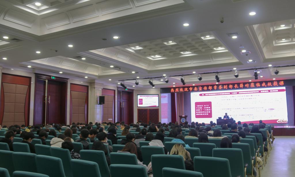 薛竹同志从党的十九届五中全会的基本情况,全面把握新发展阶段,准确把握二O三五年远景目标和“十四五”时期我国发展的指导方针、主要目标、重点任务,深刻认识构建新发展格局,坚持党的全面领导,动员各方面力量为实现“十四五”规划和二O三五年远景目标而团结奋斗等5个方面,结合市委五届九次全会精神进行了系统深入的讲解,并就当代青年学生关心的毕业就业创业等问题进行了分析解答。