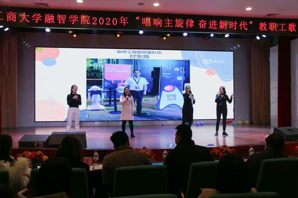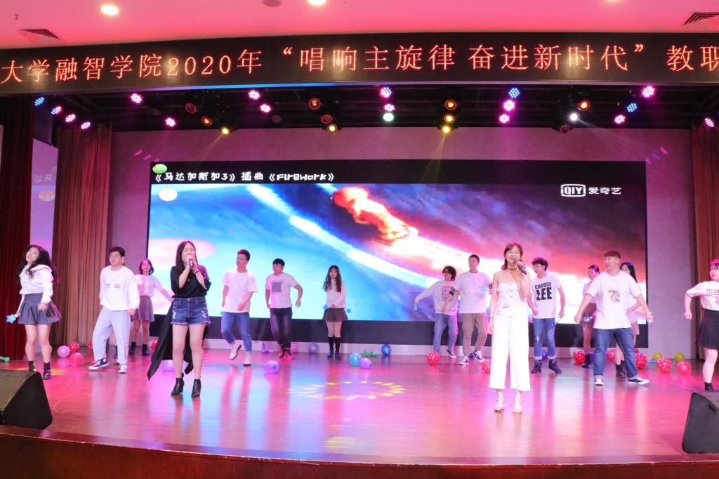 比赛正式开始,由经济学院工会带来的节目《Firework》瞬间把整个比赛的氛围推向了高潮。随后各工会依次登场,其中歌曲机关工会《你的答案》、马克思主义学院工会《黄土高坡》、教辅工会《逆光》、软件学院工会《我们都是追梦人》、财富管理学院工会《只要平凡》、会计学院工会《你曾是少年》、讯飞人工智能学院工会《风吹麦浪》、金融学院工会《她说》等节目深受大家喜爱。最后一个参赛曲目是由新媒体艺术学院工会选送的《奔向前方》,歌词由学院教师原创,充分展现了融智教职工为了学院发展、为了实现个人价值的人生理想,歌曲以说唱的形式展现出了不一样的教师风采,博得现场阵阵掌声。