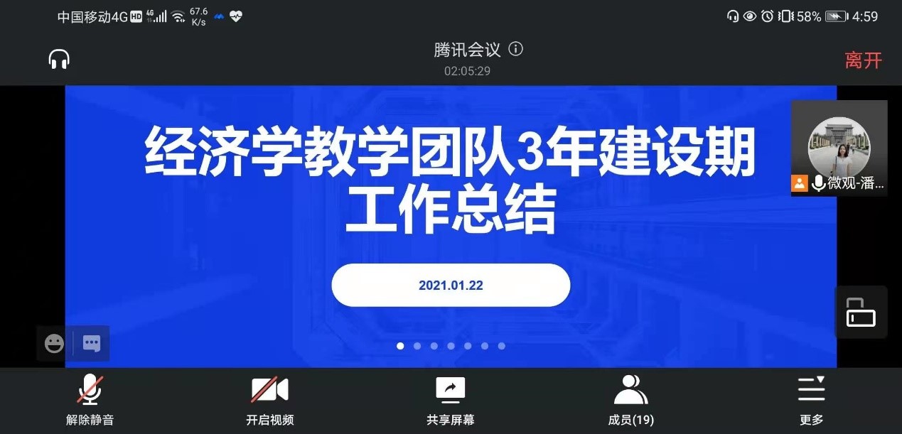 1月22日下午15:00,我校经济学教学团队在腾讯会议(ID:330 319 244)召开三年建设期工作总结会,团队队长潘曦主持会议,团队首席教授李政军、经济学院院长李红平及团队全体成员参加会议。
