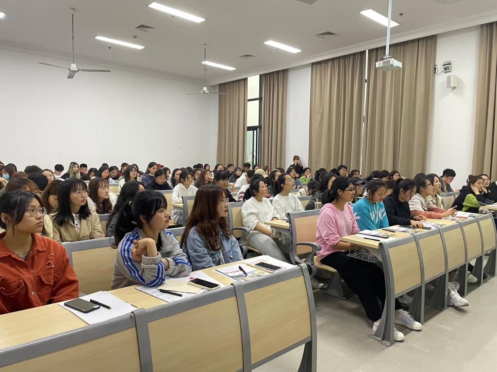 此次韩语公开课活动的主讲教师为槿言国际小语种培训学校的夏金漫老师。夏老师毕业于韩国梨花女子大学,在韩学习生活五年有余,教学经验丰富。公开课伊始,夏老师从入门的韩文元音和辅音讲起,介绍了韩语词汇构成和简单句句型。稍后,夏老师以辅音口诀“歌德不识字”讲授了韩语中松音、紧音和送气音的发音要领。深入浅出、富有感染力的教学方式使得现场学生学习韩语的热情高涨。从语言到文化,夏老师还为学生们分享了韩国充满活力的街头文化、美食和购物。最后,槿言国际小语种培训学校负责人梅杰老师介绍了校内“精品韩语学习培训班”相关情况。