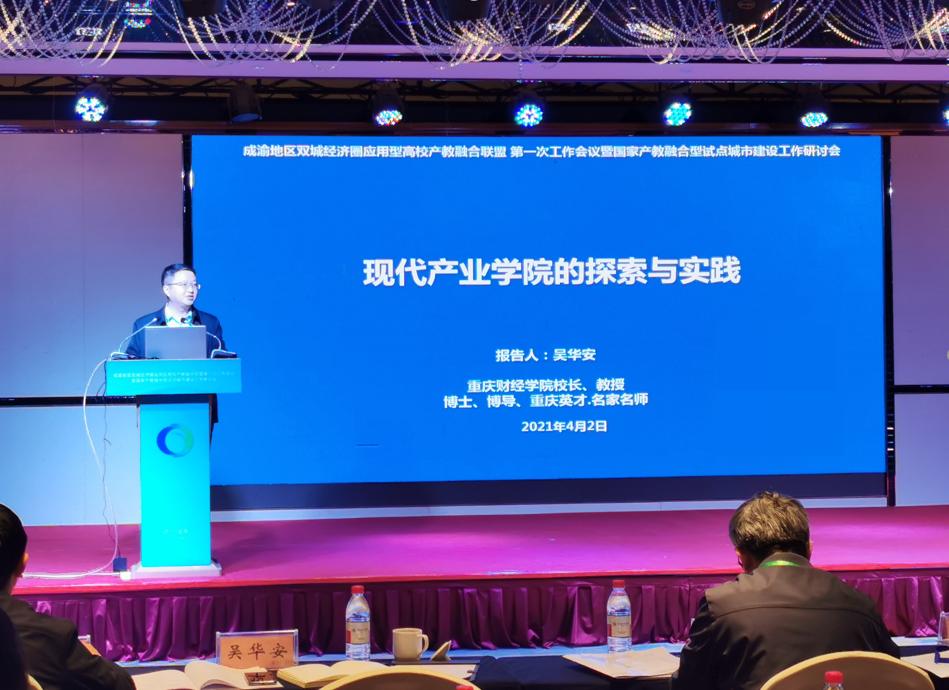 会议第二阶段,重庆科技学院尹华川校长、成都工业学院陈传伟副校长、澳门新葡京博彩吴华安校长、四川外国语大学成都学院沈光临副校长以及新道科技有限公司西南区总经理侯爱华围绕成渝地区高等教育一体化发展、现代产业学院探索建设,校企融合、产教融合、政行企校多主体协同育人等作了主题报告。我校吴华安校长以现代产业学院的探索与实践为主题,分别从现代产业学院的初浅认识、实践做法、改进方向和未来展望四个方面向大会做主题报告。这些前沿调研成果和具体实践为应用型高校的发展给出了命题、解答了难题,是联盟在“共谋共兴、共建共享、共通共融”的理念下取得的重要理论和实践成果。