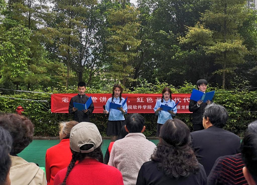 “我志愿加入中国共产党……随时准备为党和人民牺牲一切,永不叛党。”随着铿锵有力的誓词,大学生党员首先与社区党员群众一起面对党旗庄严宣誓,重温入党誓词,与党旗合影,再一次带领每一位党员重温当年入党的使命担当。随后,社区老党员刘成策同志为我们讲述了建党以来中华民族波澜壮阔的光辉历程,让同学们感受到了中国共产党人如何探索革命救国、如何排除一切困难、如何不畏艰险的英雄气概。接下来大学生党员们通过朗诵《七月的天空》展现了青年学子朝气蓬勃,以及对革命党员先烈的崇高敬意。来自巴蜀实验幼儿园的李芃宇小朋友,用稚嫩的声音为我们生动的讲述了革命烈士“小萝卜头”的故事。活动最后全体党员和社区群众一起合唱《没有共产党就没有新中国》,以激昂嘹亮的歌声表达了深切的爱党之情。