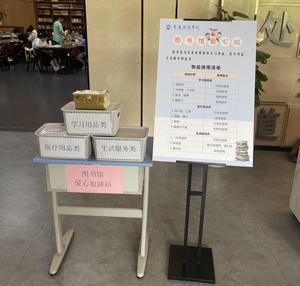 “爱心加油站”为学生在图书馆的学习不仅提供了便利,而且也解决学生的不时之需和应急需求。