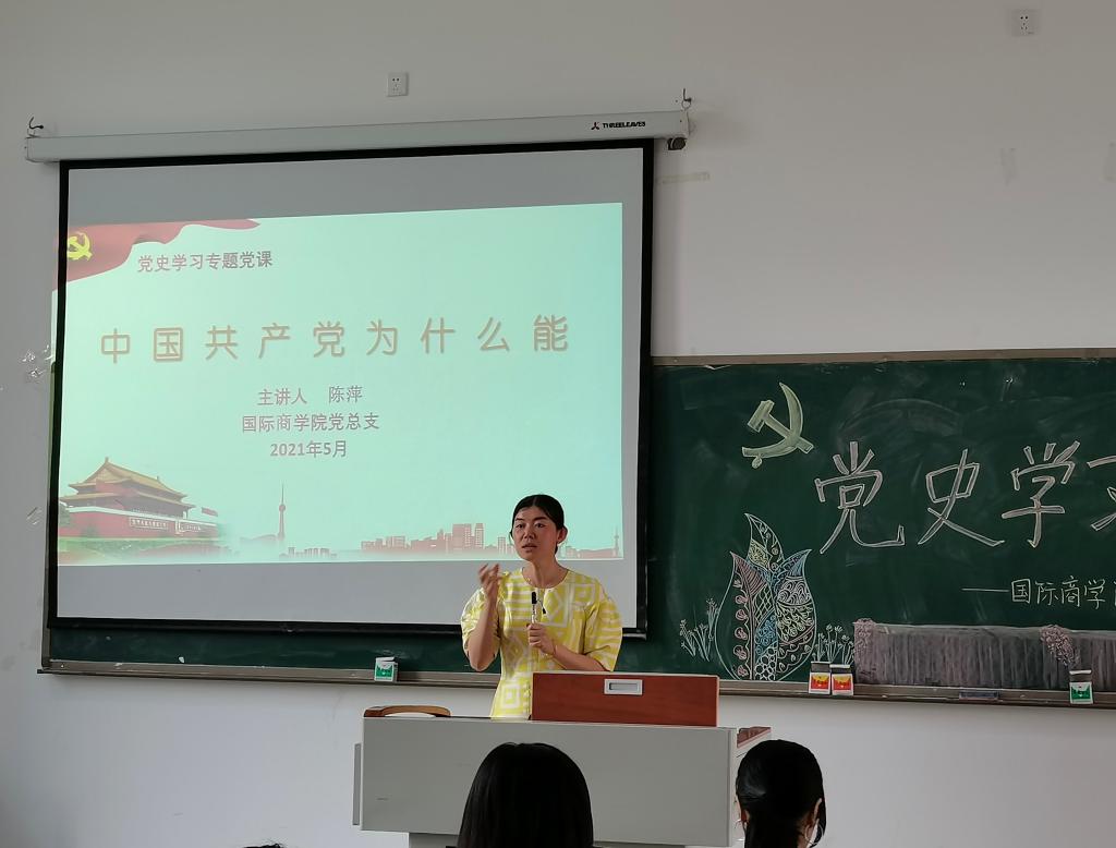 学史明理学史增信学史崇德学史力行。自党史学习教育动员大会以来,学校各基层党组织、各单位把开展党史学习教育作为今年的一项重大政治任务来抓,党史学习教育在学校蔚然成风。2021年5月10日,国际商学院师生联合党支部在教学楼1514教室组织全体党员同志开展党史学习教育专题党课,国际商学院党总支副书记陈萍同志作为主讲人带领各位党员同志认真开展党史学习。