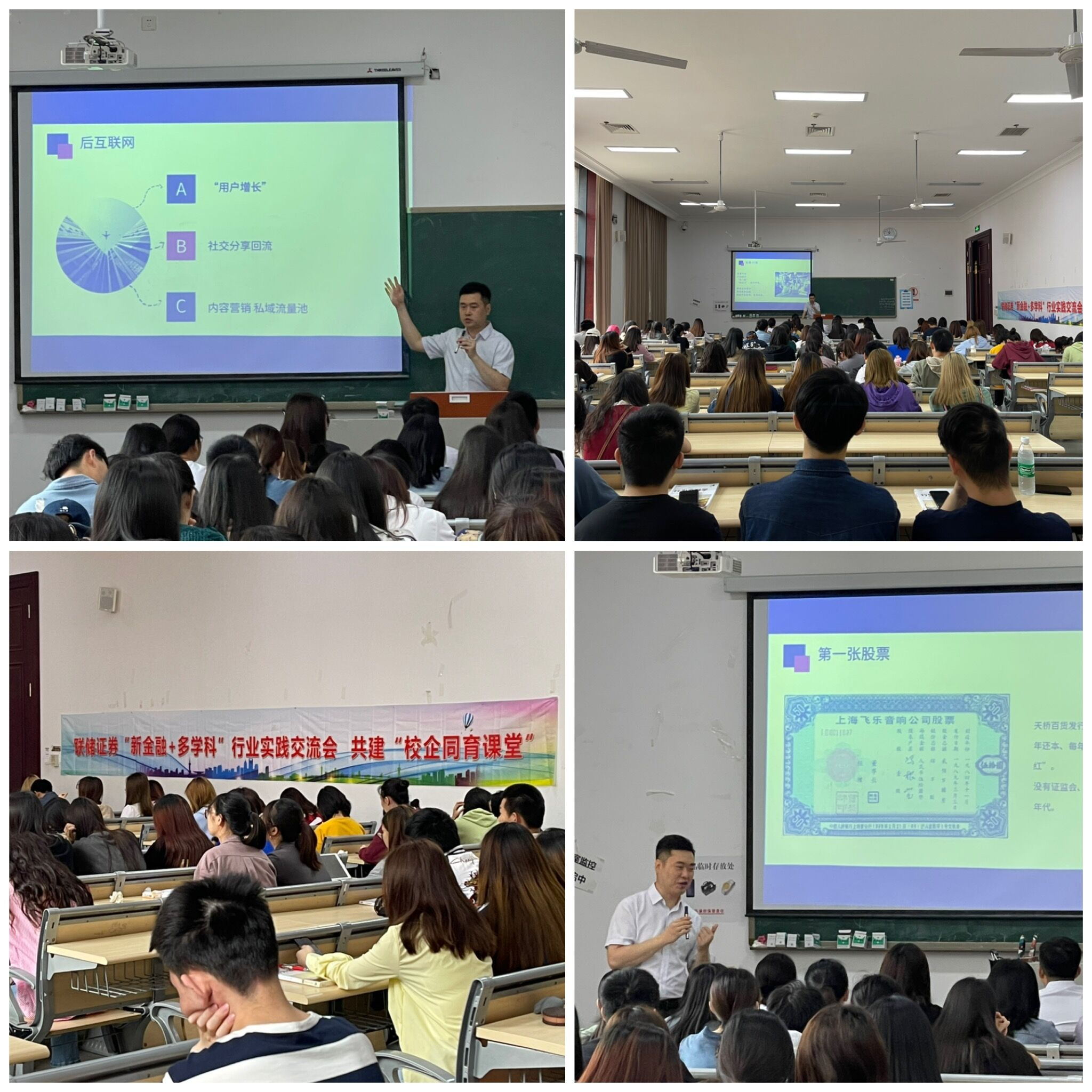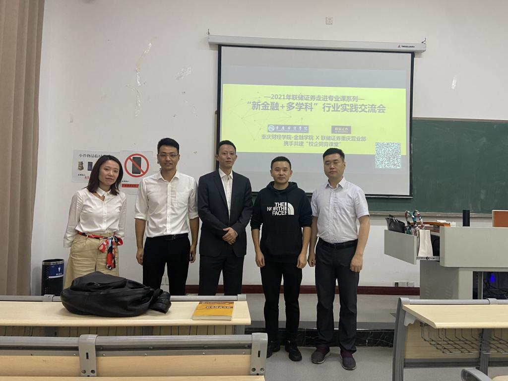为进一步强化专业内涵、创新育人模式、践行跨学科产教融合育人理念, 5月25日,金融学院与联储证券有限责任公司携手举办“2021联储证券走进专业课系列活动”之“新金融+多学科”行业实践交流会。联储证券重庆营业部总经理牛旭、副总经理兼市场开发部负责人魏翔、副总经理兼投资顾问部与财富管理中心负责人胡秋果、财经作家兼财商科普讲师胡瑞等作为课堂嘉宾应邀出席,与金融学院《行为金融学》专业课主讲教师郭静林一起参与专业课知识教学和行业经验分享。本次交流覆盖18级金融学专业证券期货方向与银行管理方向、经济与金融专业的160多名学生。