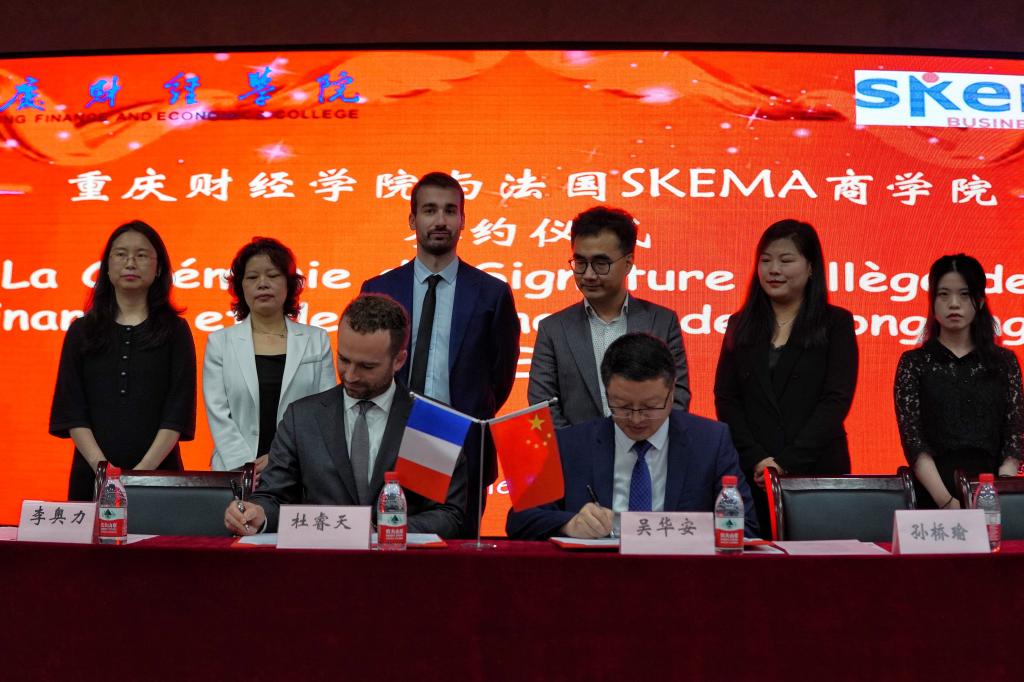 6月3日下午,我校与法国SKEMA商学院签署合作协议,签约仪式在学术报告厅举行。法国高等教育署成都中心负责人李奥力(Pierre Olivier CAMARET)、重庆办事处负责人陈佳、法国SKEMA商学院中国校区校长杜睿天(Matthieu DUMONT)、校际合作与招生录取经理杨娟、法国安卡创投亚洲区总经理孙桥瑜及我校校长吴华安出席了签约仪式。仪式由校长助理房朝君主持。