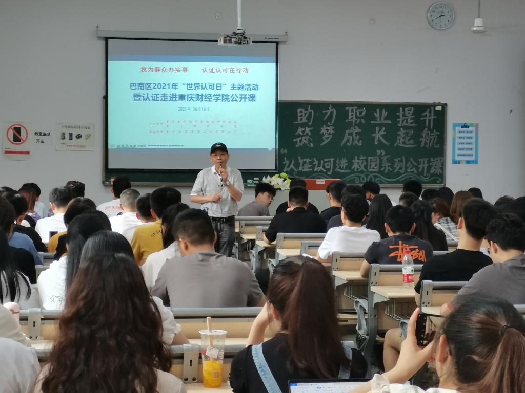 “建设质量强国是高质量发展必然要求。”为响应国家经济高质量发展,加强认证认可知识普及教育,让高校师生关注认证认可工作,增长见识,使学校师生成为认证认可的受益者、监督者和宣传者。2021年6月18日下午2:30,物流工程学院在教学楼1520教室举行了“助力职业提升,筑梦成长启航——认证认可进校园”公开课讲座。讲座由西部十二省区市唯一参加亚太经合组织质量管理研讨会的认证专家尹洪主讲,巴南区市场监督管理局工作人员石莹主持,物流工程学院2018、2019级物流工程、工业工程专业全体学生参加。