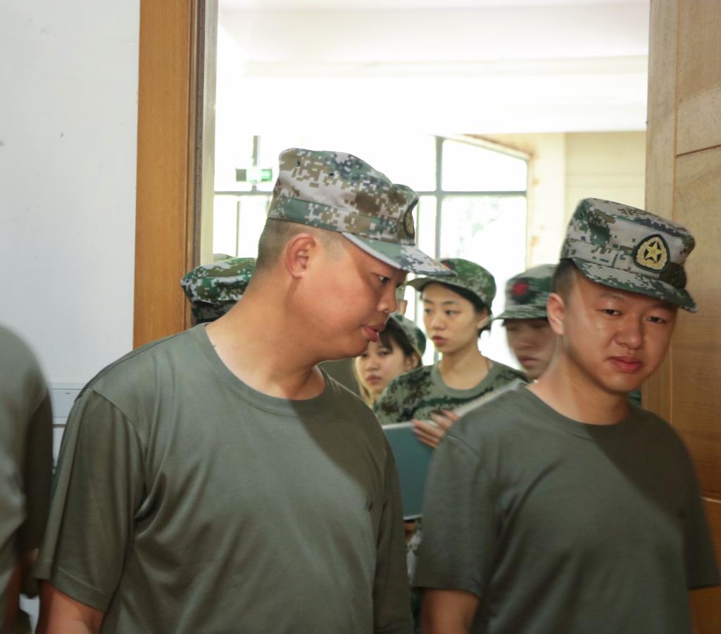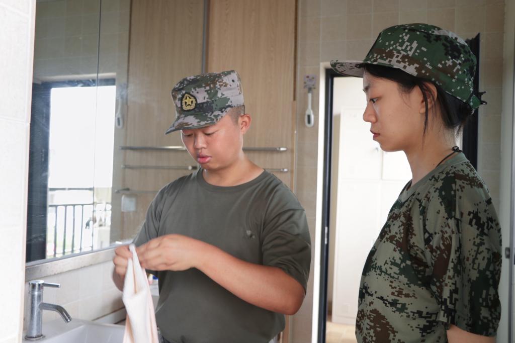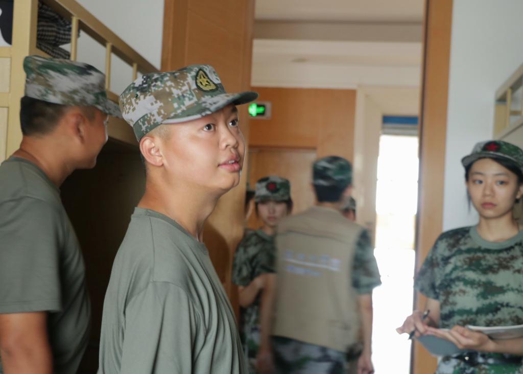 哨声一吹响,同学们整齐快速的在宿舍门口集合,等待教官检查。参谋长亲自前往2栋进行内务检查,为同学们演示物品摆放、被褥叠放,并在室内整洁方面都做了示范和指导。