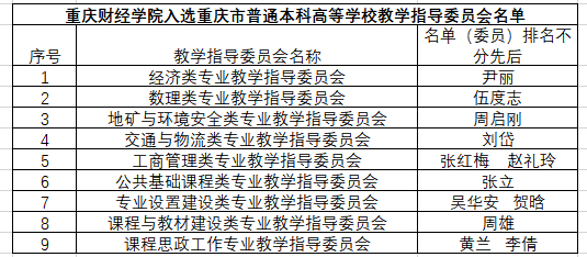 近日,市教委公布了重庆市普通本科高等学校教学指导委员会名单,我校12位教师成功入选重庆市普通本科高等学校教学指导委员会。 学校将全力支持市教学指导委员会工作,并将充分发挥我校入选的教指委专家委员力量,指导我校大力推进本科人才培养模式改革,加强专业、课程和教材内涵建设,培育高层次教学成果,不断提升学校本科教学水平和人才培养质量。
