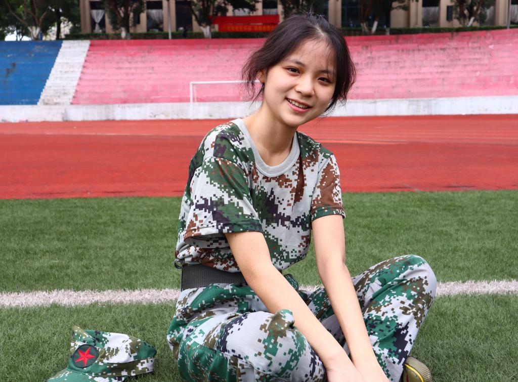 坐在草坪上,迷彩飞扬致青春,重财学子展笑颜。