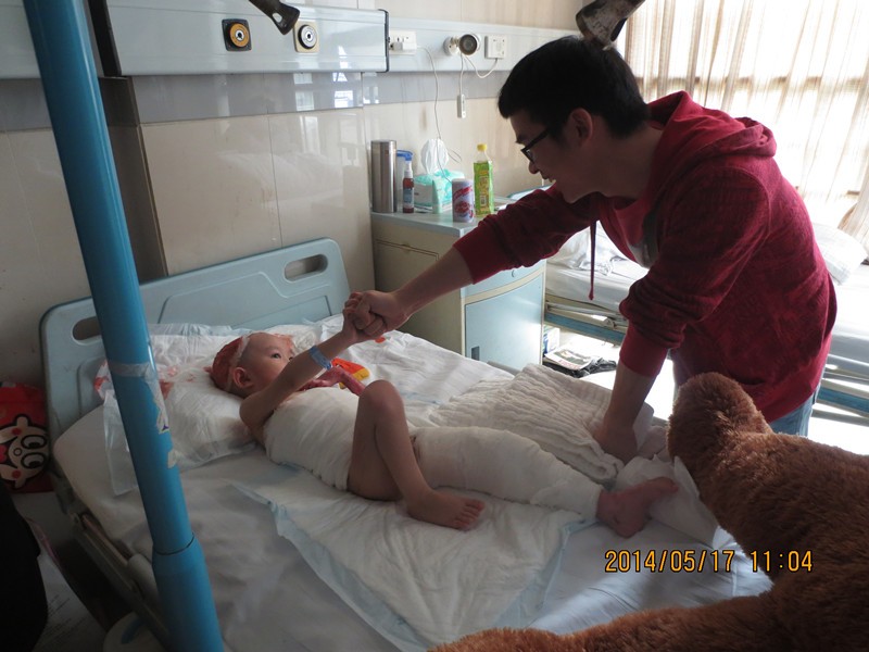 3岁的陈松龄来自贵州铜仁山村,由于父母在外务工,一直由爷爷奶奶照顾,2013年12月份,奶奶用开水洗衣服时,在一旁玩耍的小松龄不慎摔进了装满开水的盆中。小松龄穿着厚厚的棉袄,没有经验的奶奶立即将他的衣服和裤子脱了下来,强烈的撕扯更是拉伤了小松龄的皮肤。造成全身46%被严重烫伤,当地医院建议立即转院治疗。 2014年5月4日小松龄转入西南医院治疗时,由于感冒几乎每天都在发烧,最高的时候烧到了40℃。经过医院医务人员的精心治疗,孩子的伤情已经有所好转。