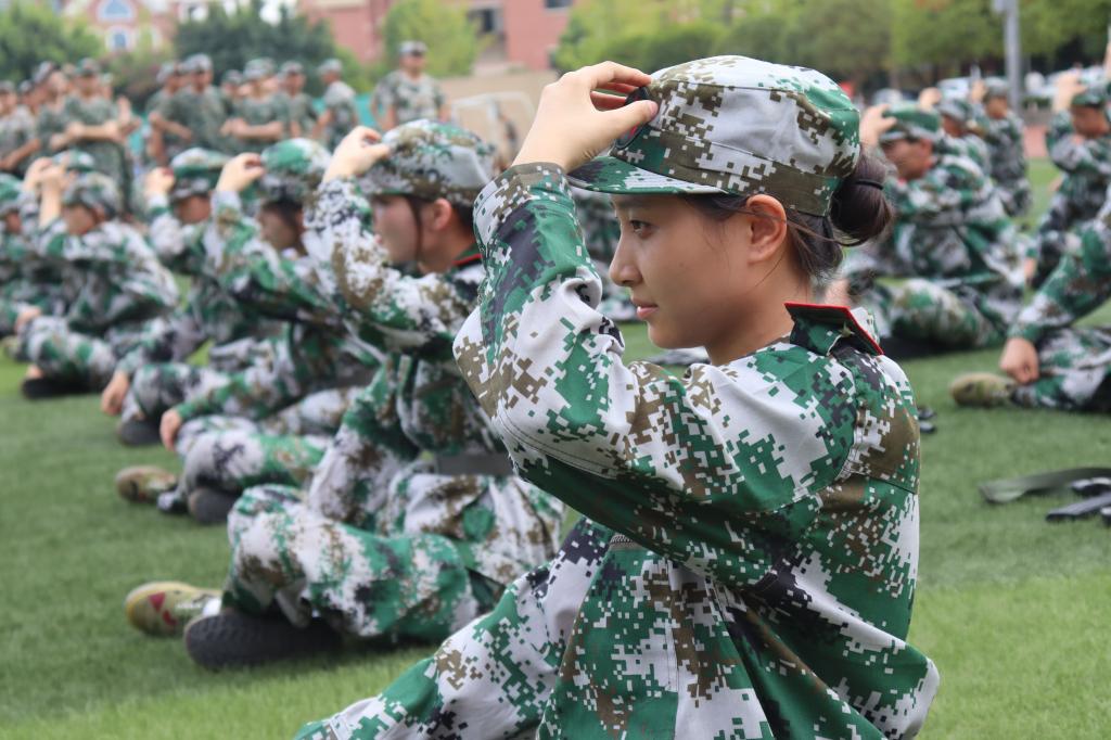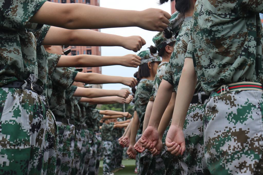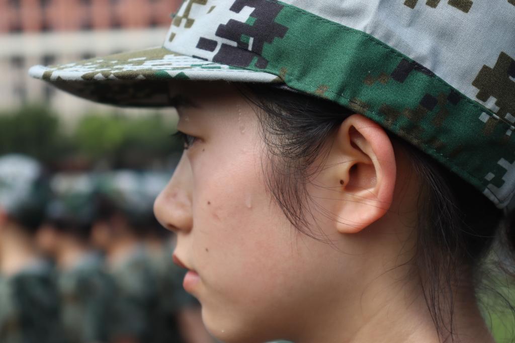 踏步声如雷贯耳,与雨珠滴落在训练场的频率共振。女生连队里,她们双手交叠,放于腰间。单腿直立,保持平衡。伴随哨声,踏步行走。声声动地,节奏明快。颗颗汗珠从额头渗出,青春气息喷薄而发。