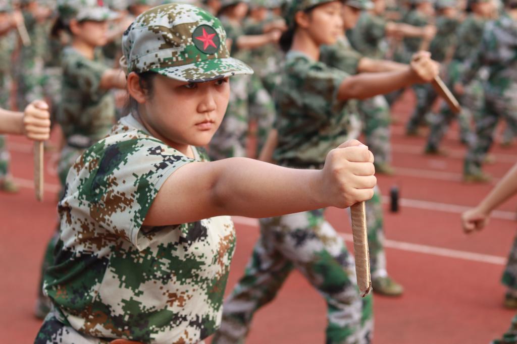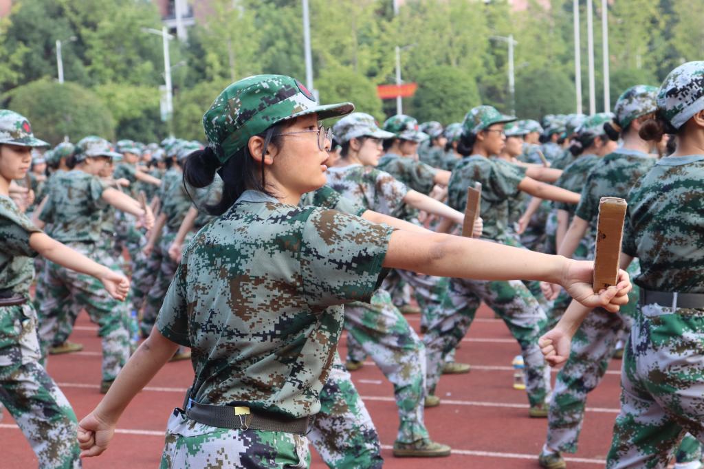 一声令下,刀出鞘,双腿并拢,两臂微屈,右手握刀,刀尖微微向后。左手握拳,右脚用力下踏,左臂上挡后摆,右手挥刀猛力上刺。随后,弓步、马步、上步、转身刺击,行云流水般的一套匕首操动作复杂多变,气势恢宏,它的齐现,不仅让青绿的操场军训连队更加丰富多姿,更让军训同学们的精神面貌更加昂扬自信。