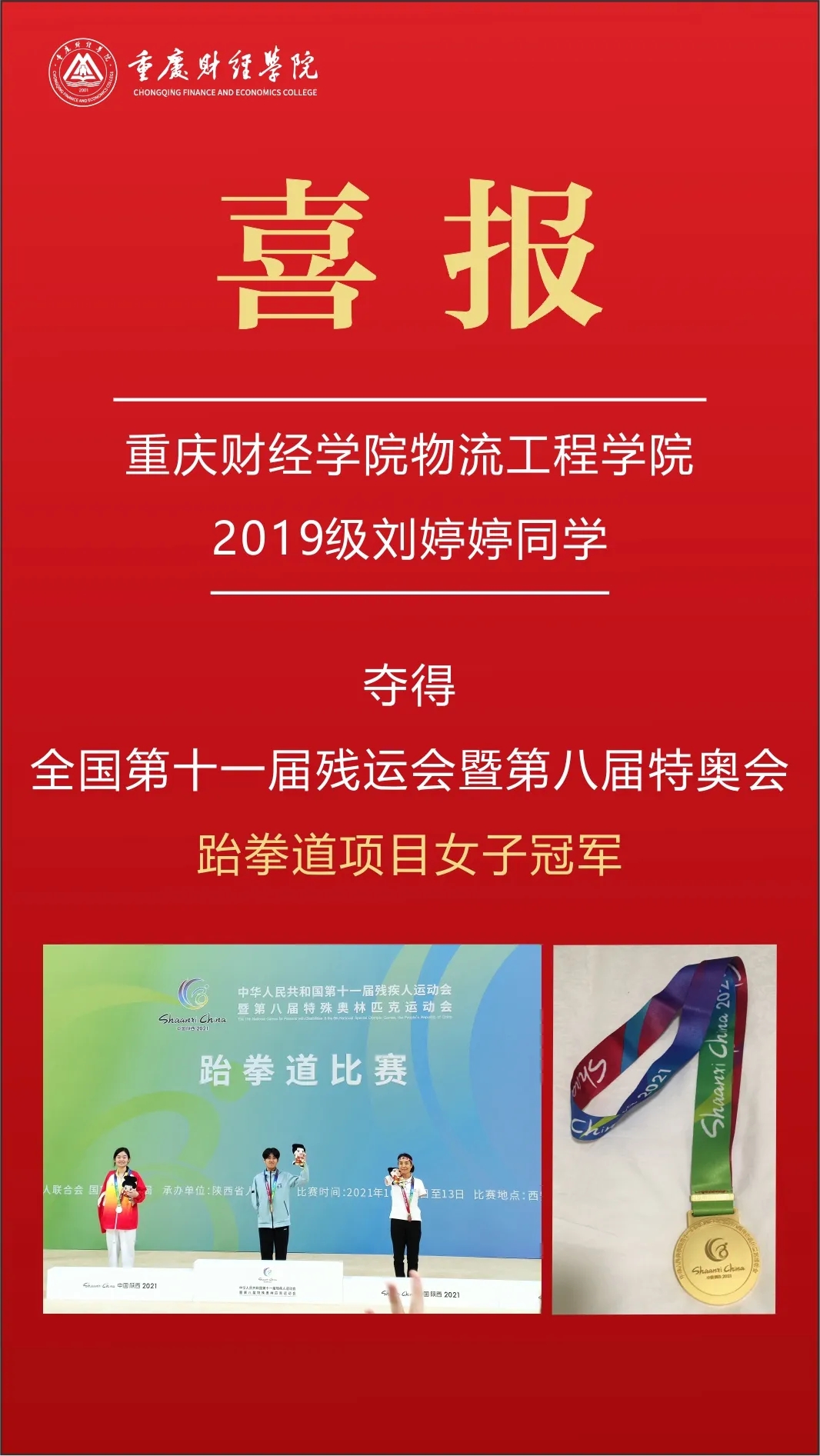 10月10日,全国第十一届残运会暨第八届特奥会跆拳道项目女子K42组49公斤级决赛在西安工程大学临潼校区文体楼举行。澳门新葡京博彩物流工程学院2019级学生刘婷婷在决赛中以15:4的比分夺得冠军。