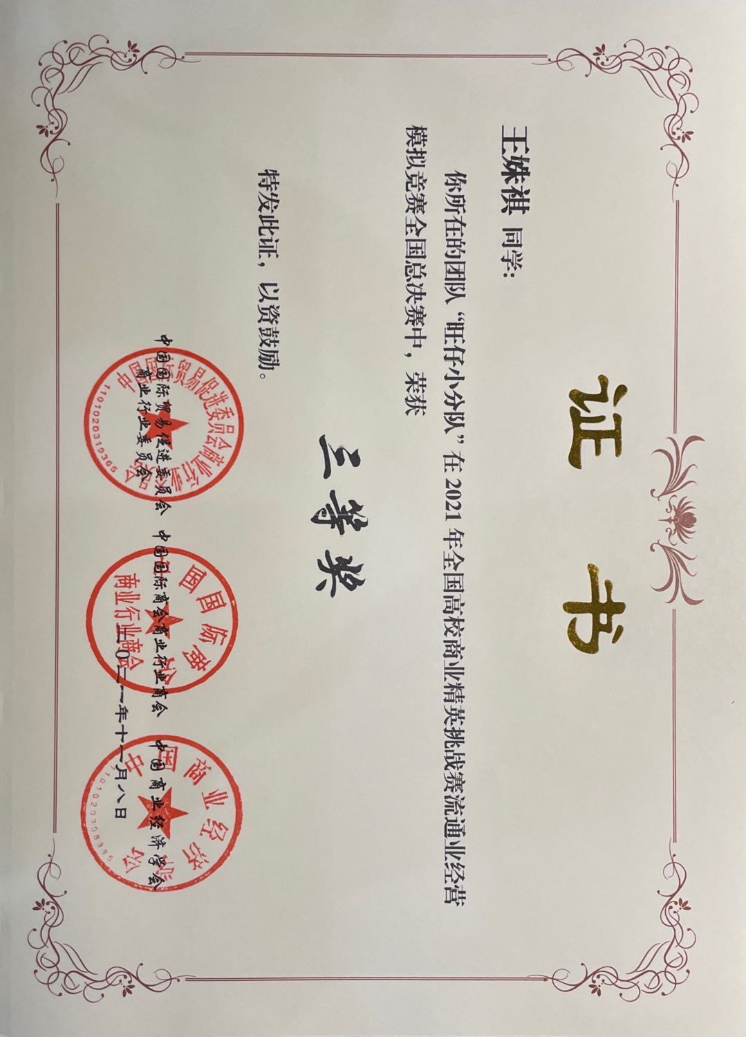 2021年10月28日,由教育部高等学校经济与贸易类专业教学指导委员会、中国国际商会商业行业商会和中国国际贸易促进委员会商业行业分会主办,深圳国泰安教育技术股份有限公司承办的2021年全国高校商业精英挑战赛“国泰安杯”流通业经营模拟竞赛大陆地区总决赛圆满落幕。由国际商学院教师李扬杰和卢芳冰指导的2支队伍喜获全国二等奖;胡欣指导的1支队伍喜获全国三等奖;3位指导老师获得“优秀教师指导奖”。