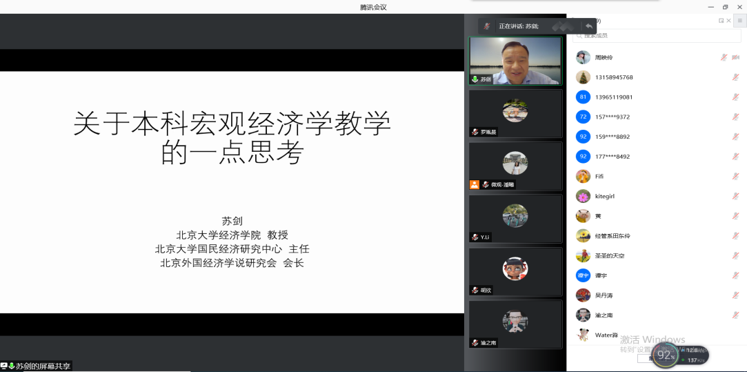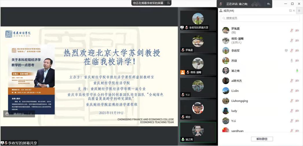 应我校经济学教学团队首席教授李政军邀请,北京大学经济学院教授、博士生导师苏剑,于2021年11月19日上午09:30-11:30,在腾讯会议(ID:624 890 867),以“关于本科宏观经济学教学的一点思考”为题,给我校经济学教学团队19位老师和来自国内三十多所高校的48位老师作学术报告。我校校长吴华安和经济学院院长李红平全程参加了会议。这次报告会不仅是我校经济学教学团队“融智育人”系列讲座第十四期,同时也是我校市级经济学课程群虚拟教研室第一次线上教研活动。