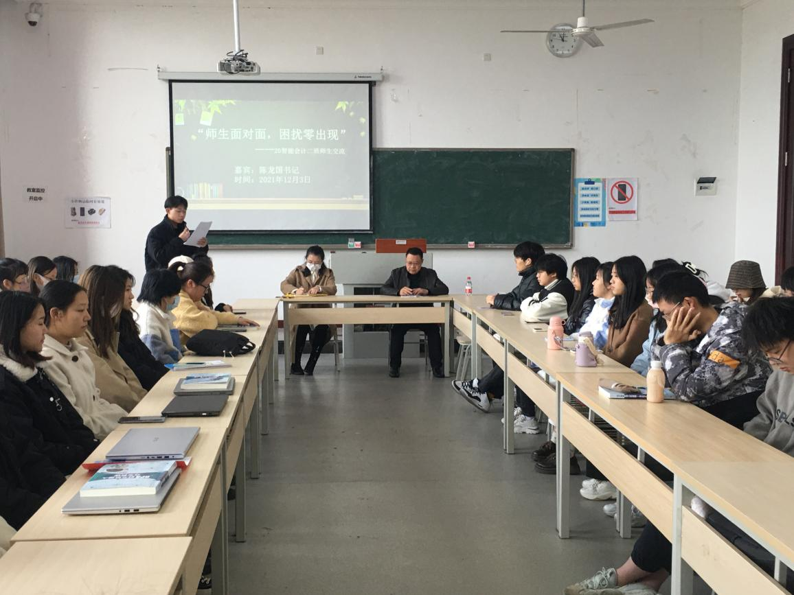 为加强学校领导干部深入基层联系学生工作,进一步落实立德树人根本任务,12月3日上午,校党委副书记陈龙国与会计学院2020级智能会计二班同学在教学楼1413教室开展了“师生面对面”座谈交流会,共计40余人参加。
