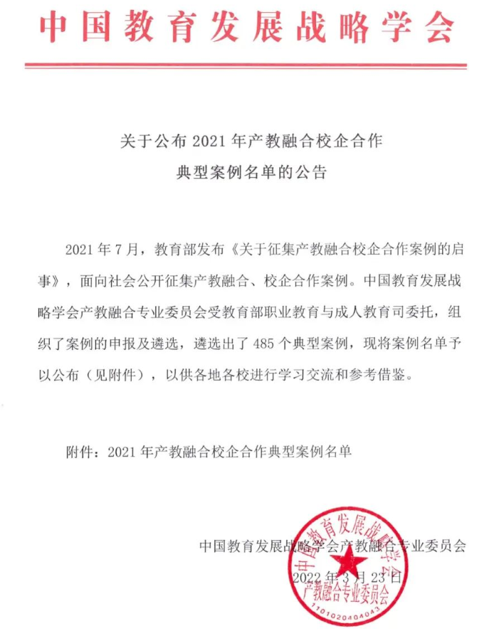 近日,中国教育发展战略学会产教融合专业委员会受教育部职业教育与成人教育司委托,发布了《关于公布2021年产教融合校企合作典型案例名单的公告》,由澳门新葡京博彩与科大讯飞股份有限公司共建的现代产业学院——讯飞人工智能学院组织申报、学校审核推荐的《基于“一院三制五融”的校企融合共生长效机制探索》作为典型案例成功入选,在485个案例中位列第1。