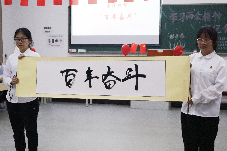 本次活动内容丰富,包含了两会精神内涵讲解、学生书法展示、党史知识竞答、书信宣誓等多个精彩环节。首先,郭忆萱同学详细讲解了两会精神内涵、阐述了两会的新思想与新战略,并带大家领略人民领袖的光辉典范。在这个过程中,同学们感悟了“百年奋斗”的内涵与真谛,知晓了“惟改革者进,惟创新者强,惟改革创新者胜。”的人生哲理,触碰到了人民领袖的可亲可敬与初心不改的为民情怀;随后,学生党员叶杨同学讲述了“脱贫攻坚,一个都不能掉队”的故事,并带领同学们了解十年团结的蓬勃力量。在故事中,同学们感受到全国人民对全面建成小康社会目标不懈追求,感悟到党和人民取得的一切成就都是团结奋斗的结果,团结奋斗正是中国共产党和中国人民最显著的精神标识。