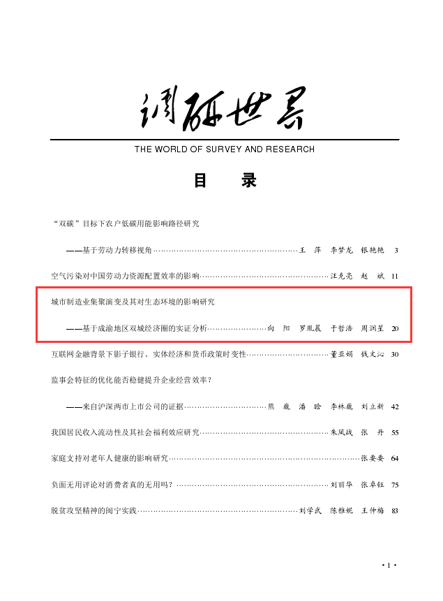 3月15日,我校经济学院2018级经济学1班本科生向阳同学在绿色发展研究院执行院长罗胤晨教授(通讯作者)的指导下,以第一作者身份撰写的学术论文《城市制造业集聚演变及其对生态环境的影响研究——基于成渝地区双城经济圈的实证分析》,正式公开发表于《调研世界》(CSSCI扩展版)2022年第3期。该文系我校本科生第一作者公开发表的首篇CSSCI级别期刊论文,实现了学校本科生C刊发表零的突破。