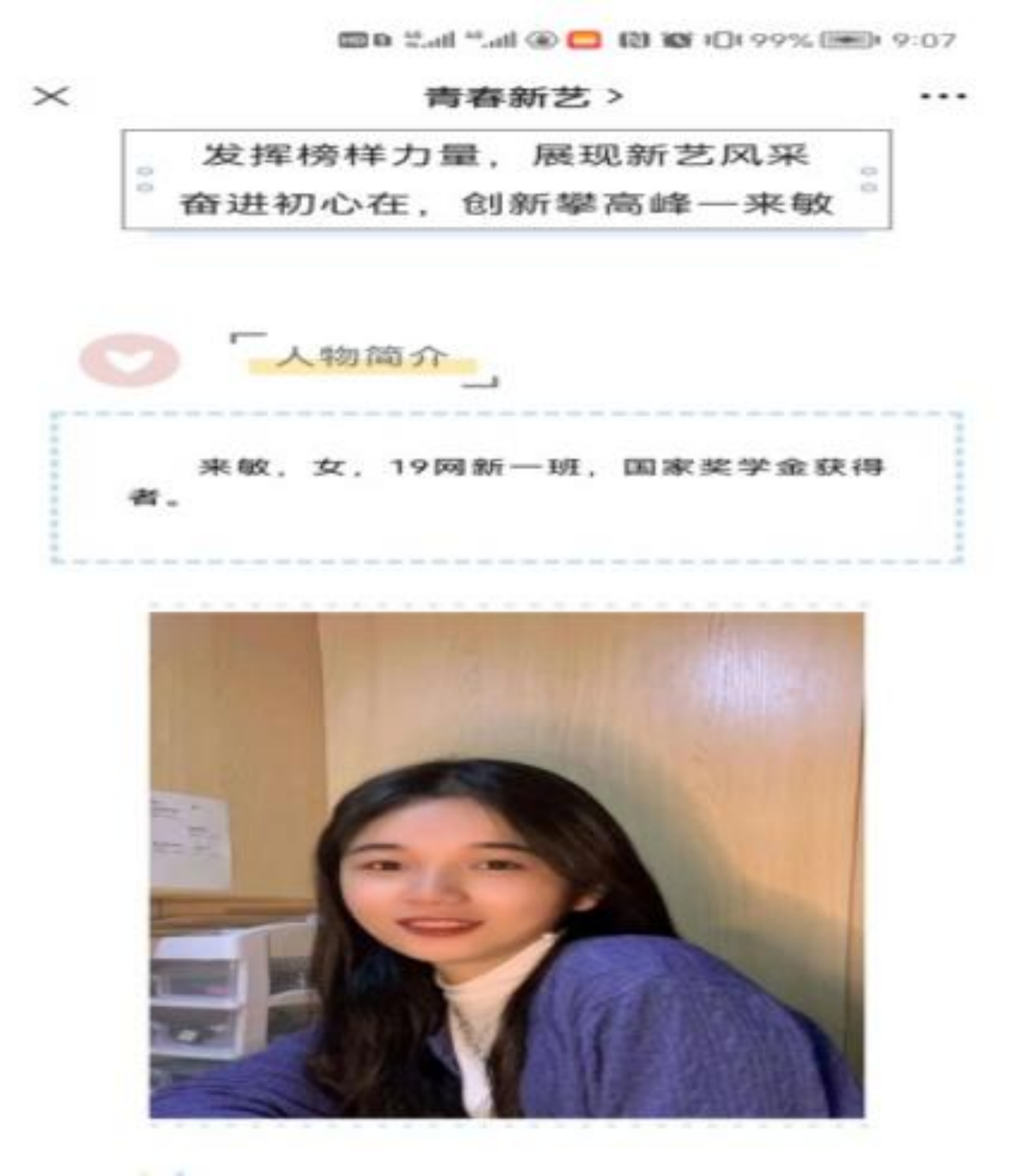 强化榜样宣传力量。学院从学业引领、竞赛能手、实践服务、考研就业等不同角度连续推出8期新艺榜样力量。先后宣传了首个国家奖学金者获得者来敏、“互联网+”市级铜奖获得团队核心骨干王梓尧、抗疫志愿者尹利君、考研强手谭权洁等同学的优秀事迹,以此彰显榜样风采,增强学生前进动力。