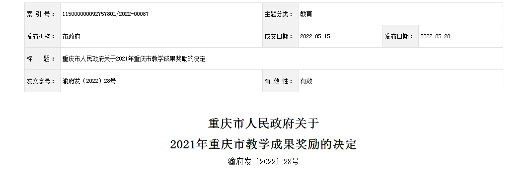 日前,《重庆市人民政府关于重庆市教学成果奖励的决定》(渝府发〔2022〕28号)印发,我校2项成果获得2021年重庆市高等教育教学成果奖,其中二等奖1项、三等奖1项,成果等级和数量再创同类高校第一,实现了省部级教学成果的新突破。