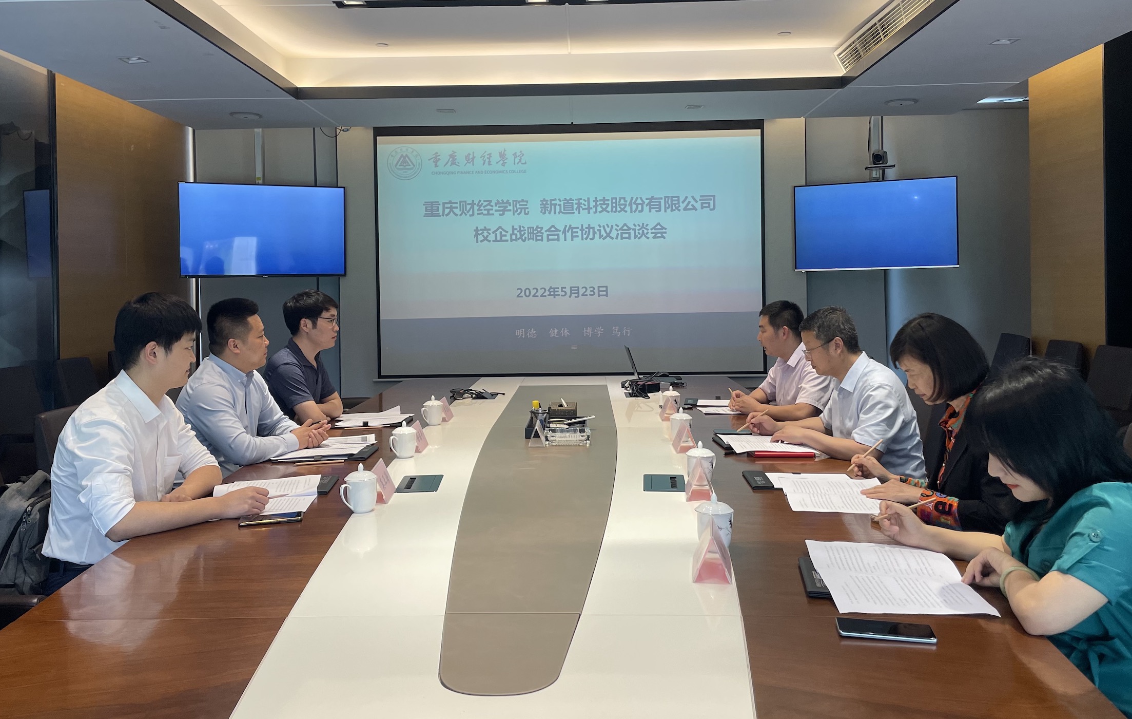 5月23日下午,我校与新道科技股份有限公司(以下简称:新道科技)校企战略合作协议洽谈会在学校产教融合实验园四楼会议室召开。新道科技重庆分公司总经理徐福年,我校校长吴华安、教务处处长黄兰、会计学科带头人章新蓉、会计学院院长谢付杰等参加会议。