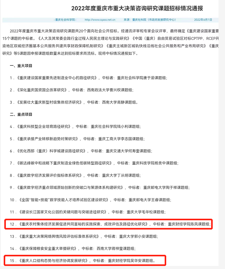 6月1日,重庆市人民政府发展研究中心发布《2022年度重庆市重大决策咨询研究课题招标情况通报》,我校吴华安教授课题组的《重庆人口结构态势与经济协调发展研究》和陈凤老师课题组的《重庆农村集体经济发展促进共同富裕的实践探索、成效评估及路径优化研究》中标。