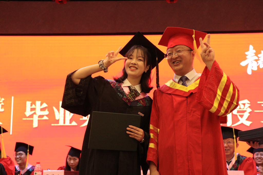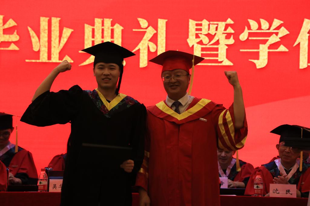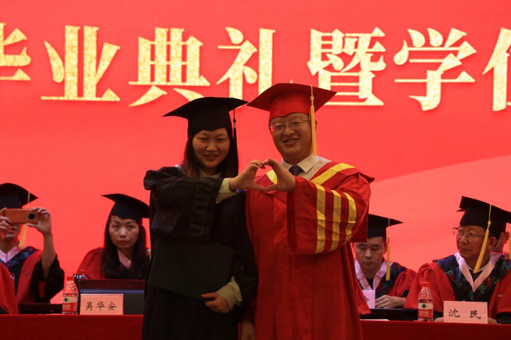 在学位授予环节,由校长吴华安为获得学士学位的毕业生颁发证书,2022届毕业生代表依次接受校长拨穗正冠,授予学位证书,并合影留恋。同学们纷纷主动与校长互动,或拥抱或比心或转圈或自拍,有的还抱起校长,激动喜悦的心情无以伦比。