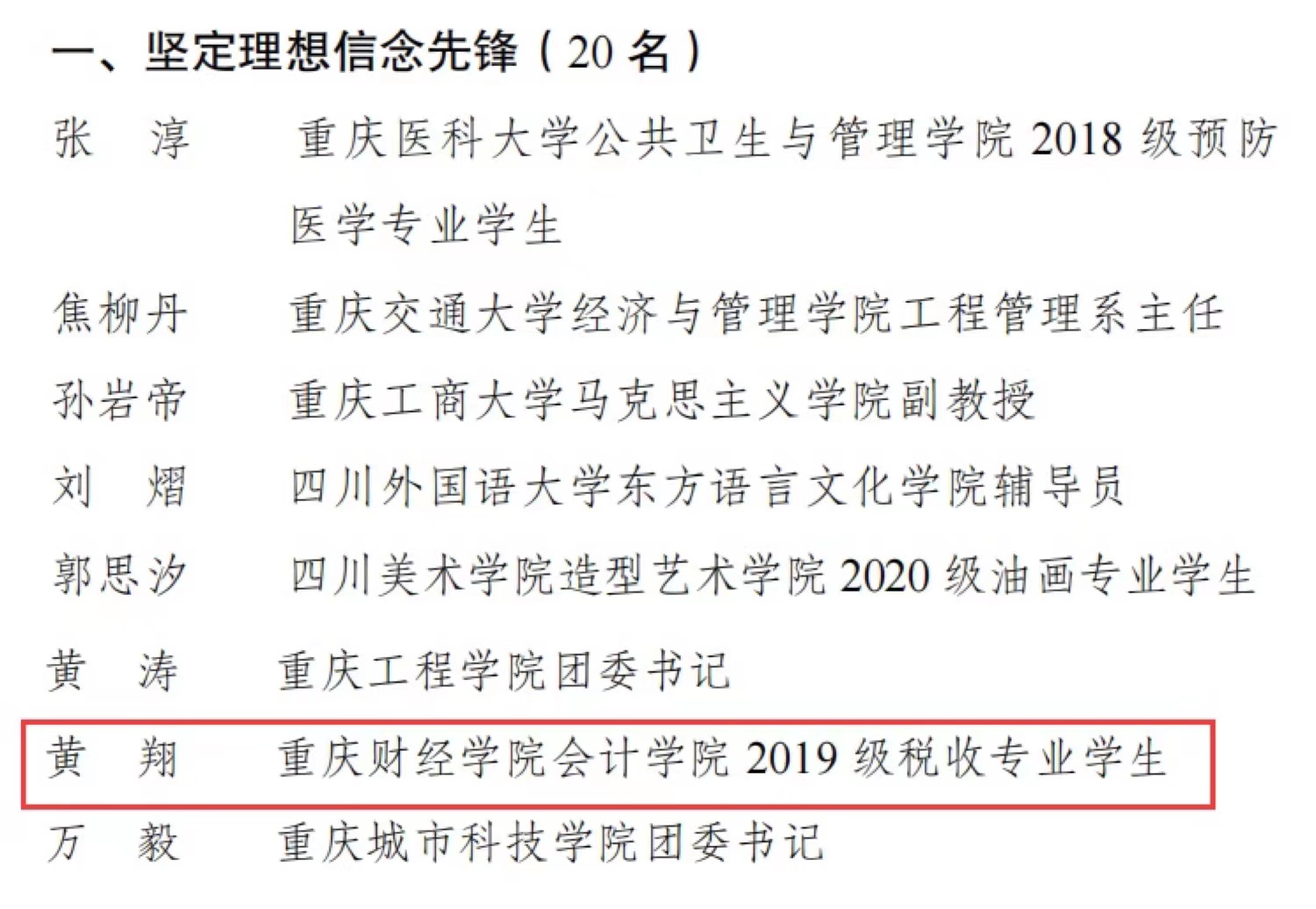 近日,2022年“双城青才校园先锋”典型选树活动评优结果在第41届川渝“校园之春”文化艺术体育活动闭幕式暨“双城青才校园先锋”颁奖礼上公布,我校会计学院黄翔、马文郡同学,物流工程学院刘婷婷同学和经济学院罗胤晨老师分别获评“坚定理想信念先锋”“练就过硬本领先锋”“矢志艰苦奋斗先锋”“培育高尚品格先锋”称号。