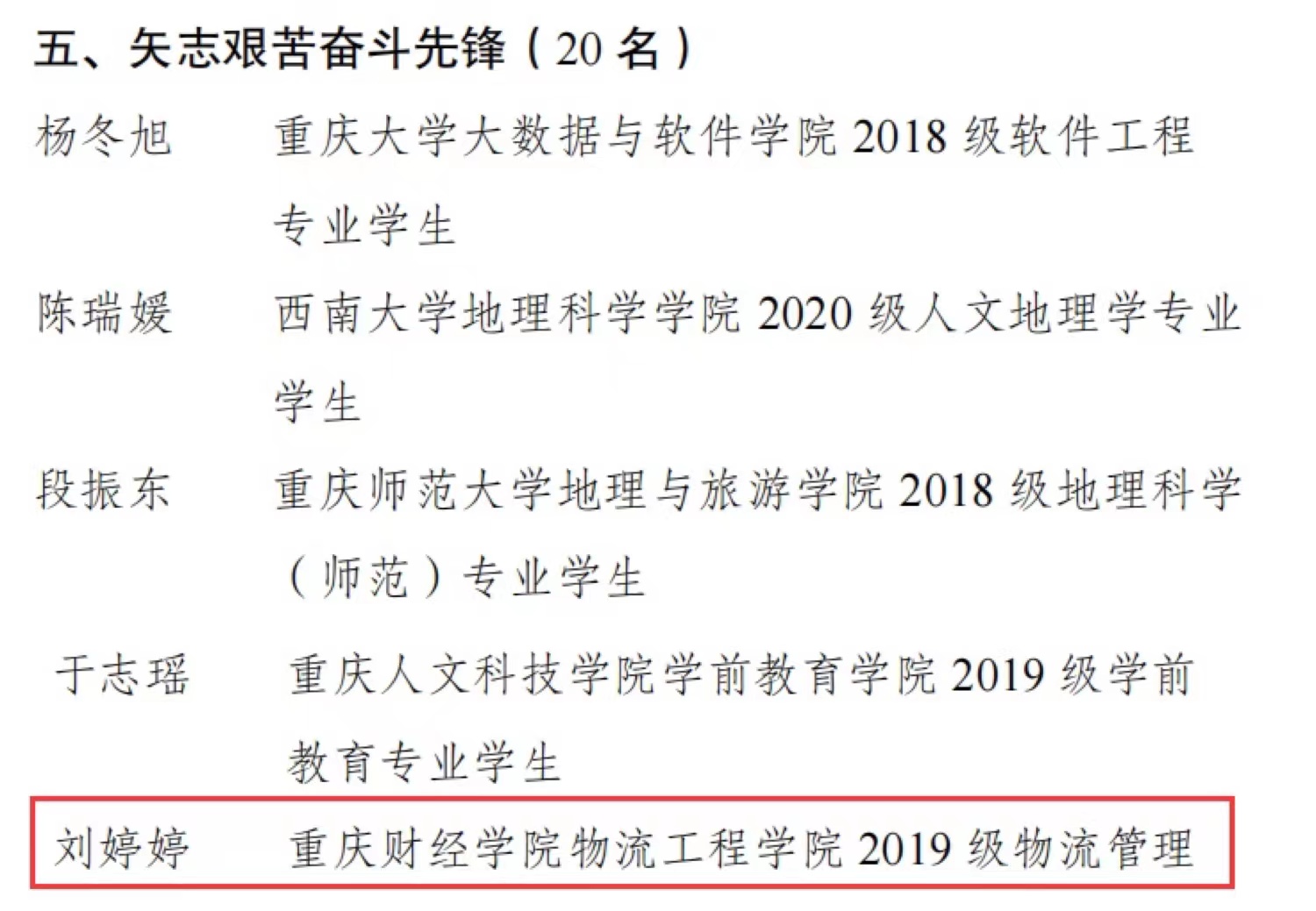 据悉,此次评选活动由共青团重庆市委、共青团四川省委、重庆市学生联合会、四川省学生联合会联合开展,围绕坚定理想信念、培育高尚品格、练就过硬本领、勇于创新创造、矢志艰苦奋斗5个类别,共选树200名“双城青才校园先锋”个人(川渝两地分别选树100名)。在本次评选中,其中4个类别我校均有师生获奖,其中刘婷婷同学作为“矢志艰苦奋斗先锋”唯一代表受邀拍摄记录宣传片,在网络直播中播放。